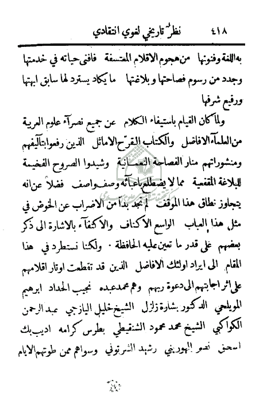 ولما كان القيام باستيفاء الكلام عن جميع نصراء علوم العربية من العلماء الأفاضل والكتاب القرح الأماثل الذين رفعوا بتأليفهم ومنشوراتهم منار الفصاحة النعمانية وشيدوا الصروح الفخيمة للبلاغة المقفعية مما لا يضطلع بأعبائه وصف واصف فضلاً عن انه يتجاوز نطاق هذا الموقف لم تجد بداً من الإضراب عن الخوض في مثل هذا العباب الواسع الاكناف والاكتفاء بالإشارة إلى ذكر بعضهم على قدر ما تعين عليه الحافظة. ولكننا نستطرد في هذا المقام إلى أيراد أولئك الأفاضل الذين قد تقطعت أوتار أقلامهم على اثر إجابتهم إلى دعوة ربهم وهم محمد عبده، نجيب الحداد، إبراهيم المويلحي، الدكتور بشارة زلزل، الشيخ خليل اليازجي عبد الرحمن الكواكبي الشيخ محمد محمود الشنقيطي بطرس كرامة أديب بك، اسحق نصر الهوريني رشيد الشرتوني وسواهم ممن طوتهم الأيام