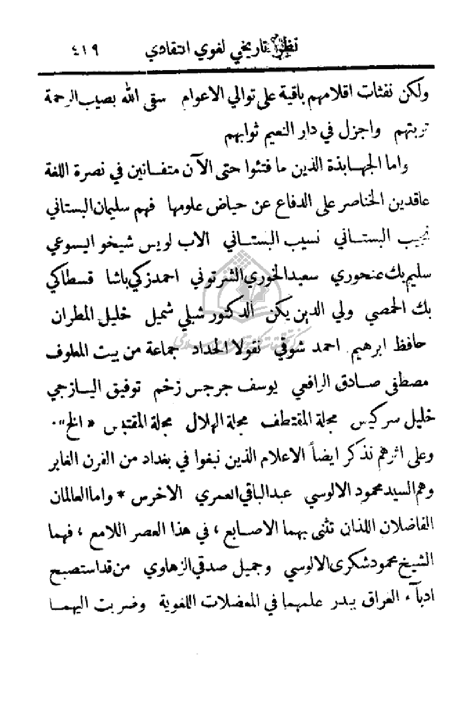 وأما الجهابذة الذين ما فتئوا حتى الآن متفانين في نصرة اللغة عاقدين الخناصر على الدفاع عن حياض علومها فهم سليمان البستاني، نجيب البستاني، نسيب البستاني، الأب شيخو اليسوعي، سليم بك عنجوري، سعيد الخوري الشرتوني، احمد زكي باشا قسطاكي بك الحمصي، ولي الدين يكن، الدكتور شلبي شميل، خليل المطران، حافظ إبراهيم، احمد شوقي، نقولا الحداد، جماعة من بيت المعلوف مصطفى صادق الرافعي، يوسف جرجس زخم، توفيق اليازجي، خليل سركيس، مجلة المقتطف، مجلة الهلال، مجلة المقتبس (الخ). وعلى أثرهم نذكر أيضاً الأعلام الذين نبغوا في بغداد من القرن الغابر وهم السيد محمود الالوسي، عبد الباقي العمري الأخرس وأما العالمان الفاضلان اللذان تثني بهما الأصابع، في هذا العصر اللامع، فهما الشيخ محمود شكري اللالوسي وجميل صدقي الزهاوي من قد استصبح أدباء العراق ببدر علمهما في المعضلات اللغوية وضربت إليهما