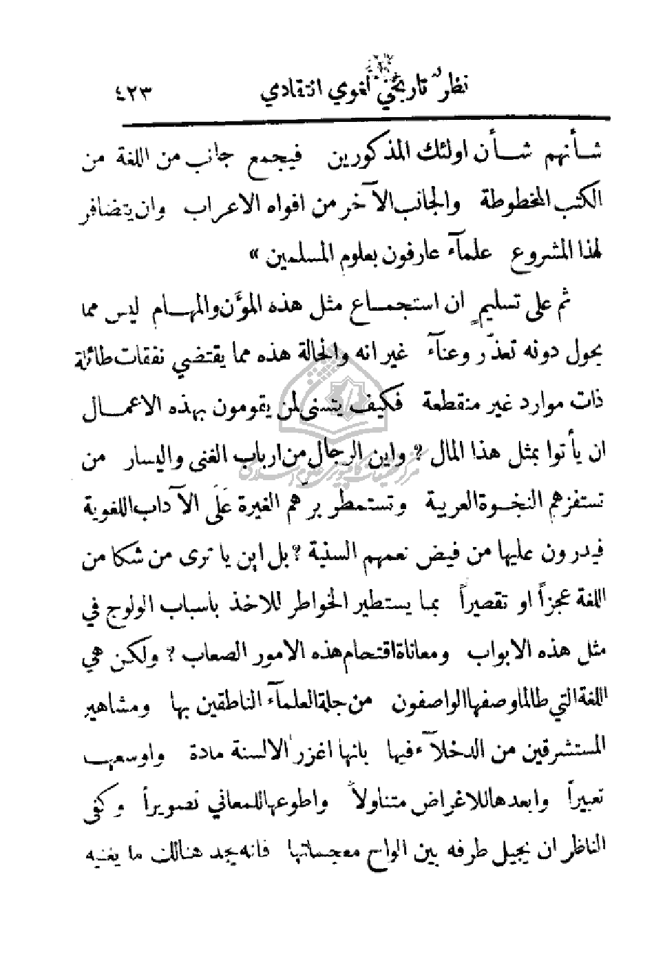 شانهم شان أولئك المذكورين فيجمع جانب من اللغة من الكتب المخطوطة والجانب الآخر من أفواه الإعراب وان يتضافر لهذا المشروع علماء عارفون بعلوم المسلمين).