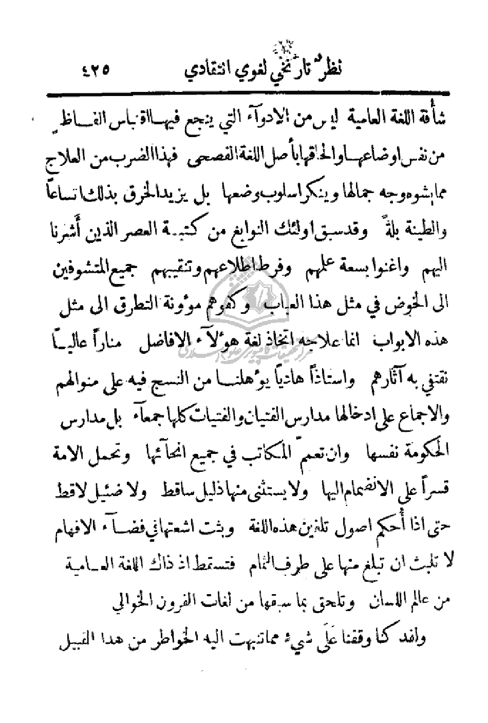 شافة اللغة العامة ليس من الأدواء التي ينجع فيها اقتباس ألفاظٍ من أوضاعها وإلحاقها بأصل اللغة الفصحى فهذا الضرب من العلاج مما يشوه وجه الجمال وينكر أسلوب وضعها بل يزيد اخرق بذلك اتساعاً والطينة بلةً وقد سبق أولئك النوابغ من كتبة العصر الذين أشرنا إليهم واغنوا بسعة علمهم وفرط اطلاعهم وتنقيبهم جميع المتشوقين إلى الخوض في مثل هذا العباب وكفوهم مؤونة التطرق إلى مثل هذه الأبواب إنما علاجه اتخاذ لغة هؤلاء الأفاضل مناراً عالياً نقتفي به آثارهم وأستاذاً هادياً يؤهلنا من النسج فيه على منوالهم والإجماع على إدخالها مدارس الفتيان والفتيات كلها جمعاء بل مدارس الحكومة نفسها وان تعمم المكاتب في جميع أنحائها وتحمل الأمة قسراً على الانضمام إليها ولا يستثنى منها ذليل ساقط ولا ضئيل لاقط حتى إذا احكم أصول تلقين هذه اللغة وبثت أشعتها في فضاء الإفهام لا تلبث أن تبلغ منها على طرف الثمام فتسقط إذ ذاك اللغة العامية من عالم اللسان وتلحق بما سبقها من لغات القرون الخوالي.