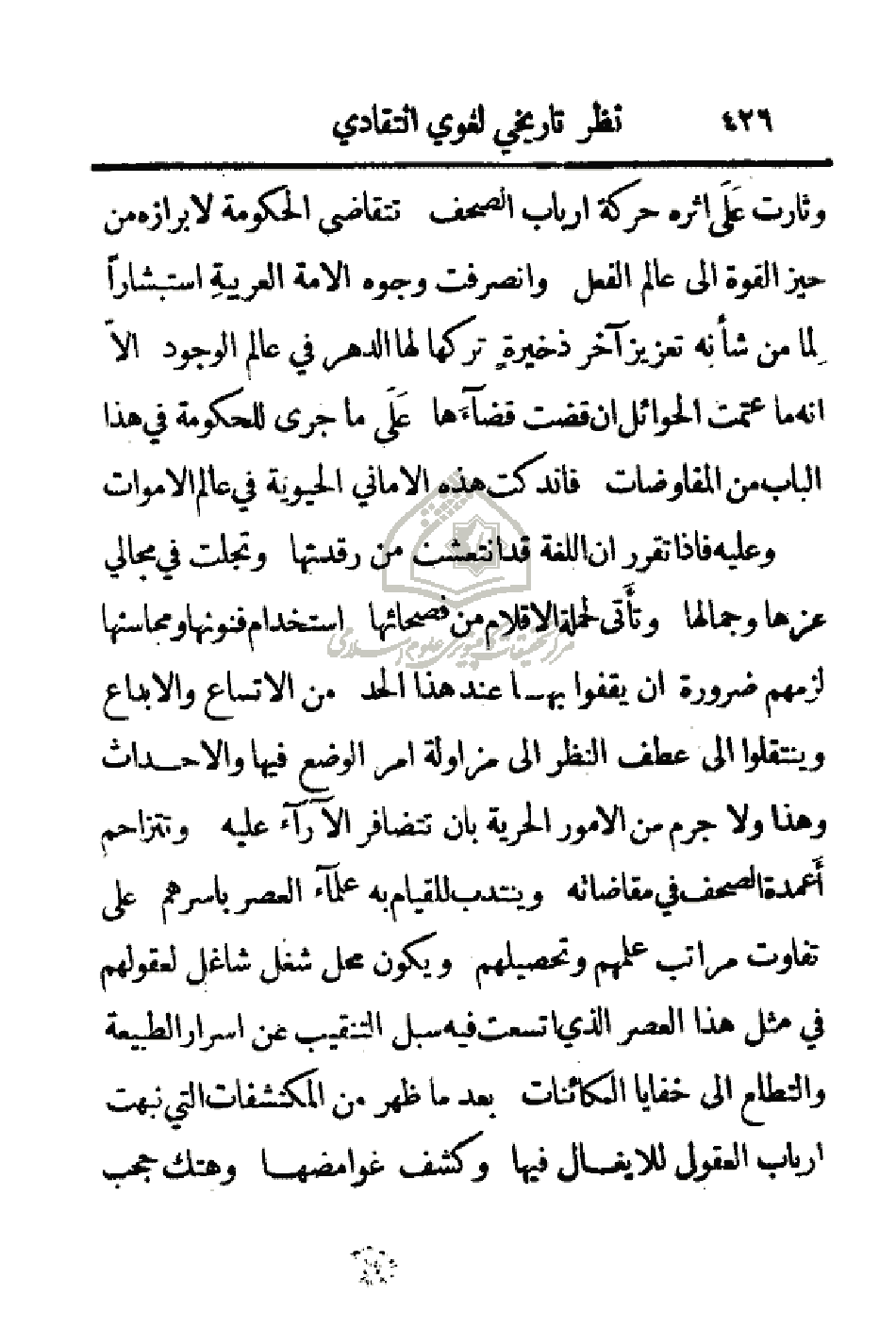 وعليه فإذا تقرر أن اللغة قد انتعشت من رقدتها وتجلت في مجالي عزها وجمالها وتأتي لحملة الأقلام من فصحائها استخدام فنونها ومحاسنها لزمهم ضرورة أن يقفوا بها عند هذا الحد من الاتساع والإبداع وينتقلوا إلى عطف النظر إلى مزاولة أمر الوضع فيها والأحداث وهذا ولا جرم من الأمور الحرية بأن تتظافر الآراء عليه وتتزاحم أعمدة الصحف في مقاضاته وينتدب للقيام به علماء العصر بأسرهم على تفاوت مراتب علمهم وتحصيلهم ويكون محل شغل شاغل لعقولهم في مثل هذا العصر الذي اتسعت فيه سبل التنقيب عن أسرار الطيبعة والتطلع إلى خفايا الكائنات بعد ما ظهر من المكتشفات التي نبهت أرباب العقول للإيغال فيها وكشف غوامضها وهتك حجب