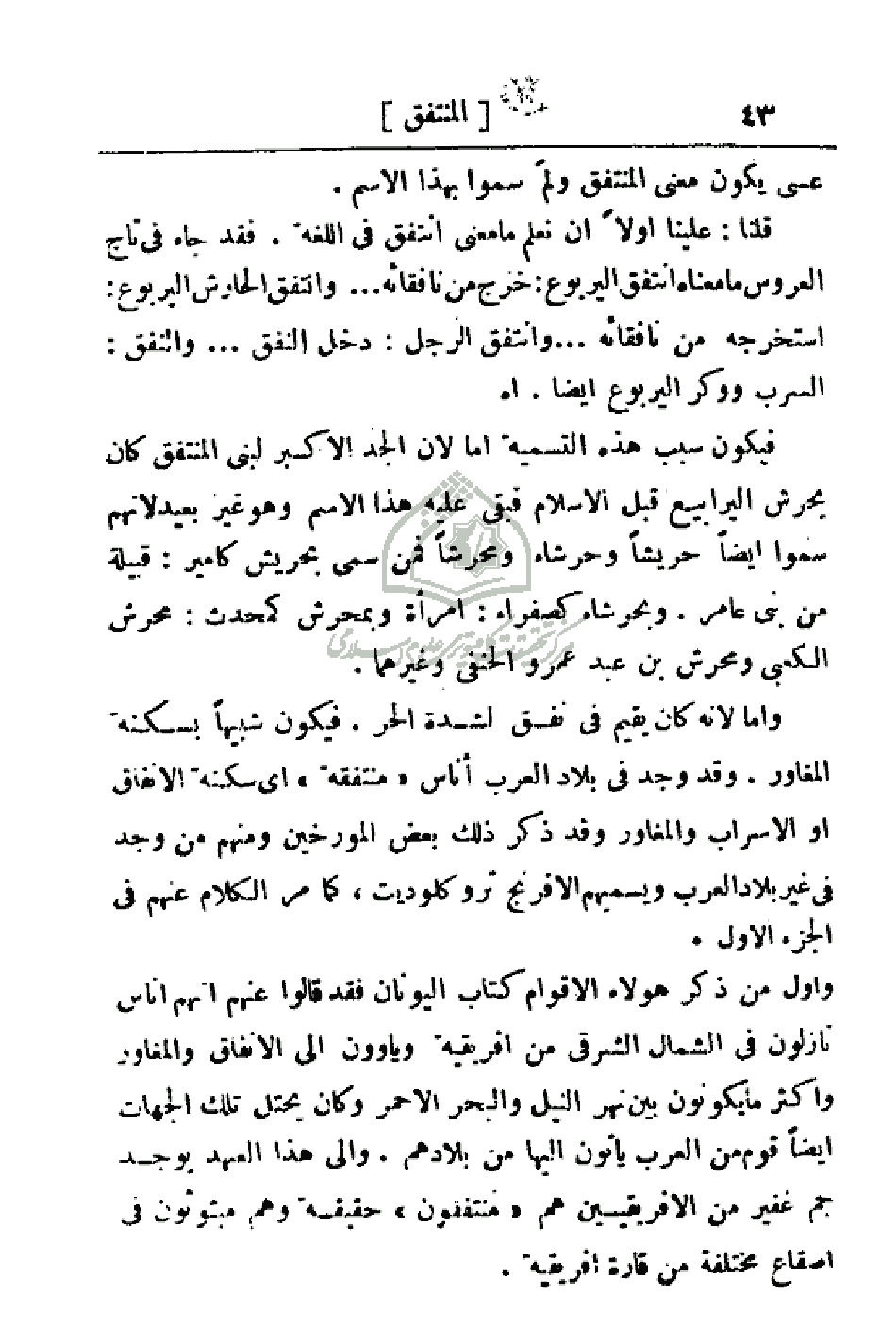 وأول من ذكر هؤلاء الأقوام كتاب اليونان فقد قالوا عنهم انهم أناس نازلون في الشمال الشرقي من أفريقية ويأوون إلى الأنفاق والمغاور وأكثر ما يكونون بين نهر النيل والبحر الأحمر وكان يحتل تلك الجهات أيضاً قوم من العرب يأتون إليها من بلادهم. وإلى هذا العهد يوجد جم غفير من الأفريقيين هم (منتفقون) حقيقة وهم مبثوثون في أصقاع مختلفة من قارة أفريقية.