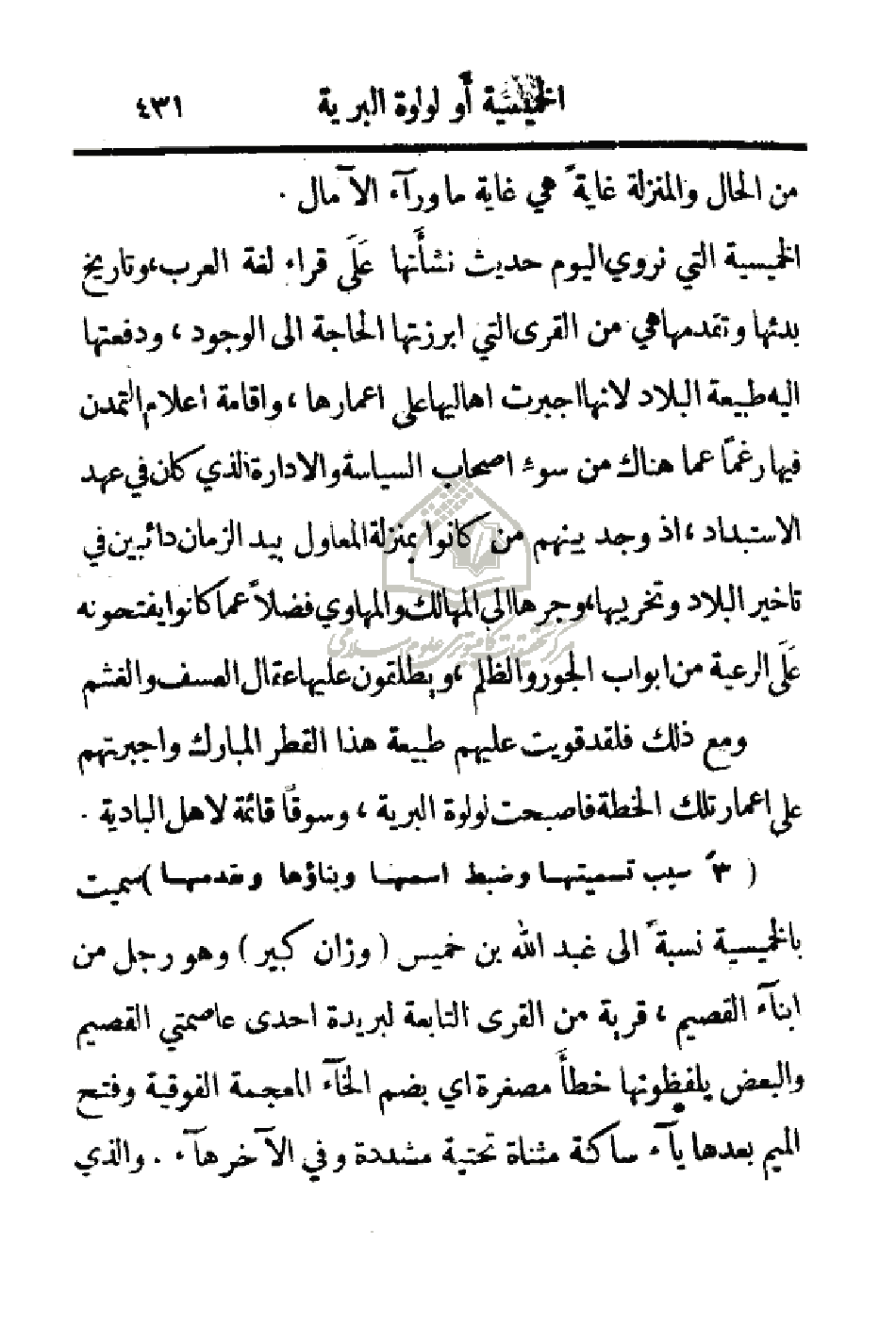 الخميسية التي نروي ليوم حديث نشأتها على قراء لغة العرب، وتاريخ بدئها وتقدمها هي من القرى التي أبرزتها الحاجة إلى الوجود، ودفعتها إليه طبيعة البلاد لأنها أجبرت أهاليها على اعمارها، واقامة أعلام التمدن فيها رغماً عما هناك من سوء أصحاب السياسة والإدارة الذي كان في عهد الاستبداد، إذ وجد بينها من كانوا بمنزلة لمعاول بيد الزمان دائبين في تأخير البلاد وتخريبها إلى المهالك والمهاوي فضلاً عما كانوا يفتحونه على الرعية من أبواب الجور والظلم، ويطلقون عليها عقال العسف والغشم