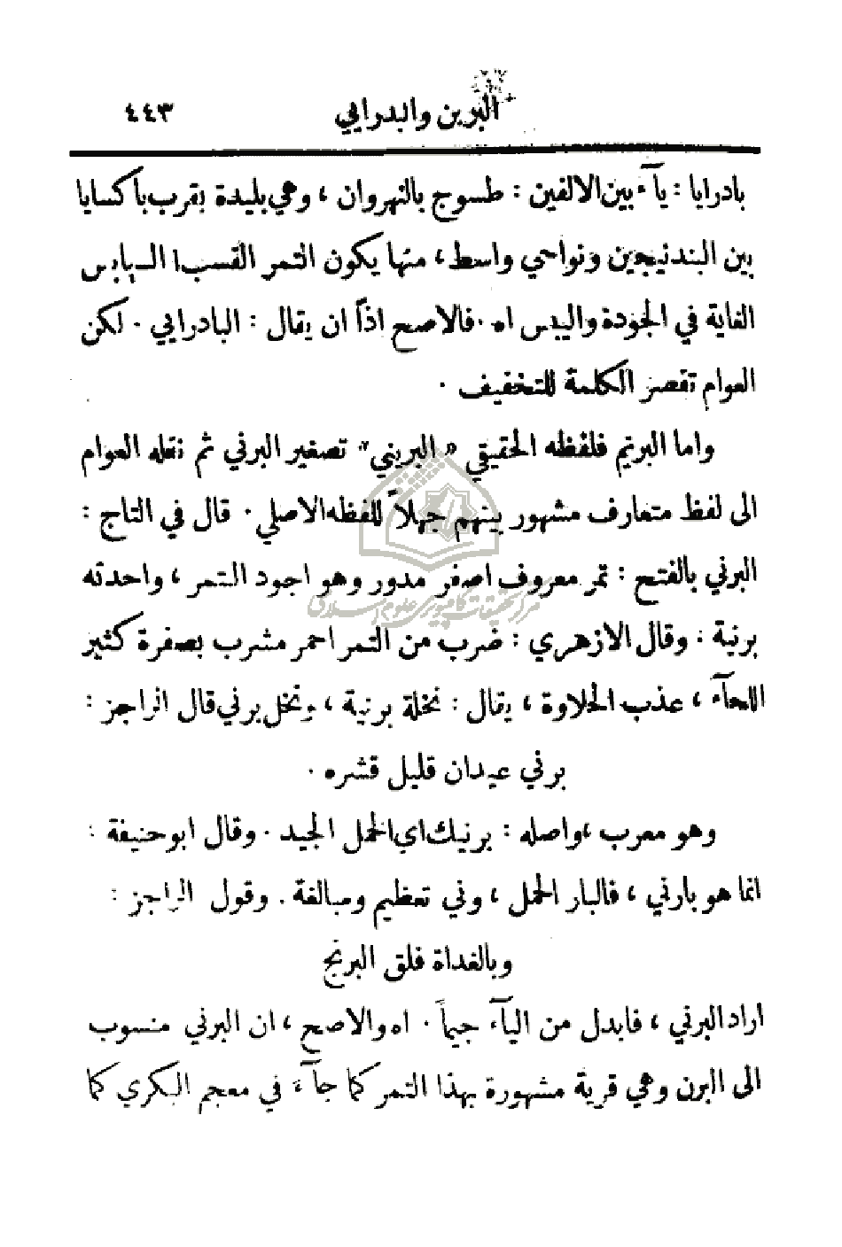 أراد البرني، فأبدل من الياء جيما. اهـ والأصح، أن البرني منسوب إلى البرن وهي قرية مشهورة بهذا التمر كما جاء في معجم لبكري كما