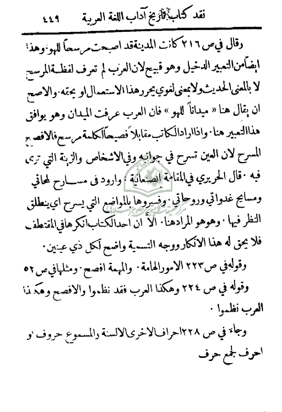 وقال في ص216 كانت المدينة قد أصبحت مرسحاً للهو وهذا أيضاً من التعبير لدخيل وهو قبيح لان العرب لم تعرف لفظة المرسح لا بالمعنى الحديث ولا بمعنى لغوي يحرر هذا الاستعمال أو يحقه والأصح أن يقال هنا (ميداناً للهو) فان العرب عرفت الميدان وهو يوافق هذا التعبير هنا وإذا أراد الكاتب مقاتلاً فصيحاً لكلمة مرسح فالأفصح المرسح لان العين تسرح في جوانبه وفي الأشخاص والزينة التي ترى فيه. قال الحريري في المقامة الصنعانية: وأورد في مسارح لمحاتي ومسايح غدواتي وروحاتي. وفسروها بالمواضع التي يسرح أي ينطلق النظر فيها. وهو المراد هنا. إلا أن أحد الكتاب أنكرها في المقتطف فلا