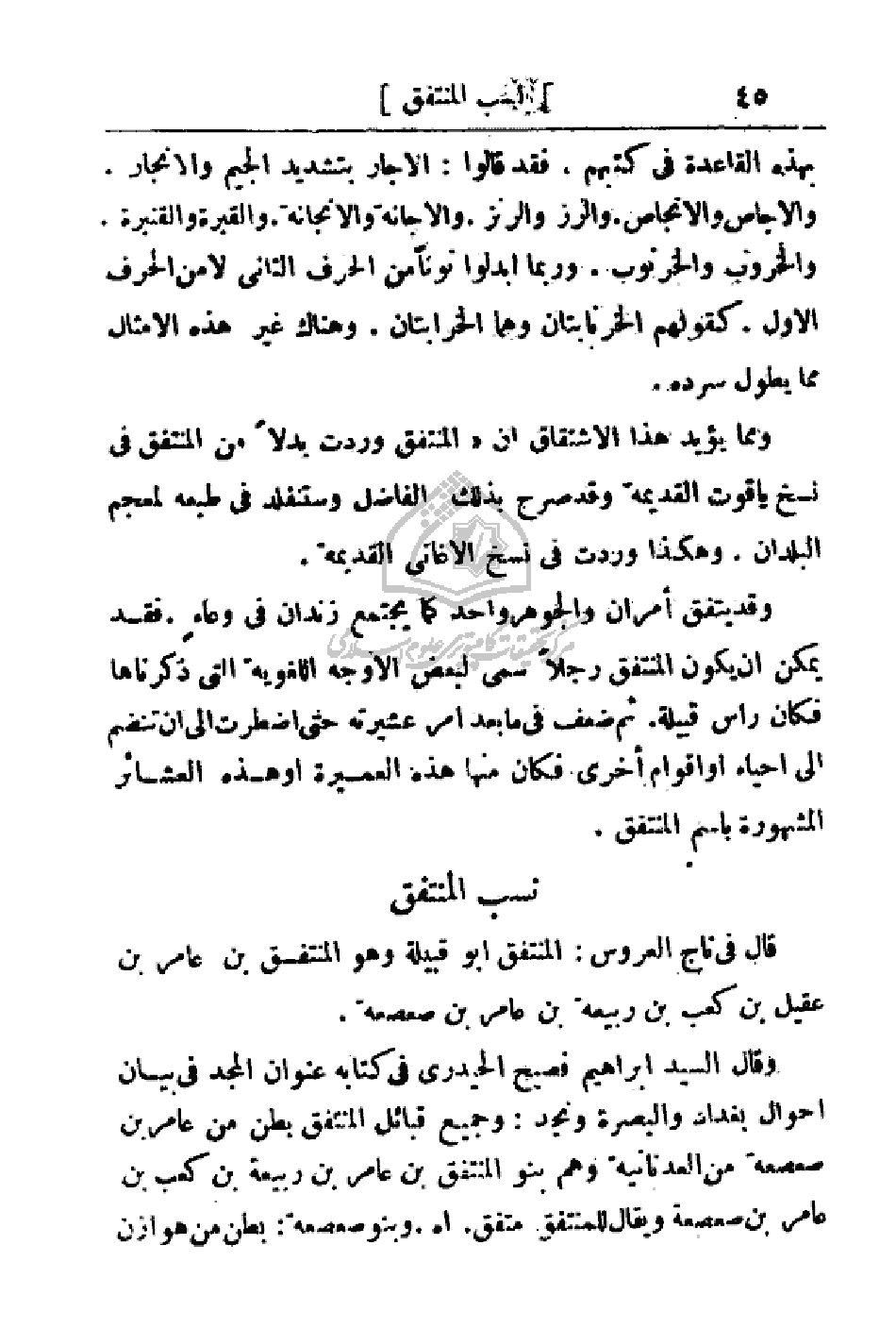 ومما يؤيد هذا الاشتقاق أن (المنتفق وردت بدلاً من المنتفق في نسخ ياقوت القديمة وقد صرح بذلك الفاضل وستنفلد في طبعه لمعجم البلدان. وهكذا وردت في نسخ الأغاني القديمة.