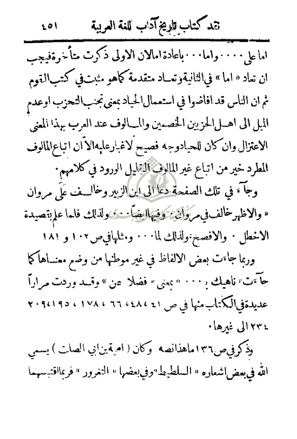 وجاء في تلك الصفحة دعا إلى ابن الزبير وخالف عَلى مروان (والاظهر خالف في مروان. وفيها أيضاً. . . ولذلك فلما علم بقصيدة الاخطل. والأفصح ولذلك لما. . . ومثلها في ص102 و181.