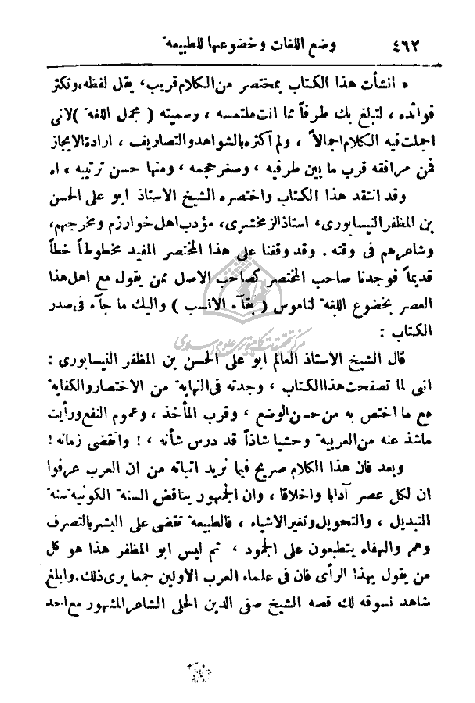 وقد انتقد هذا الكتاب واختصره الشيخ الأستاذ أبو الحسن بن المظفر النيسابوري، أستاذ الزمخشري، مؤدب أهل خوارزم ومخرجهم، وشاعرهم في وقته. وقد وقفنا على هذا المختصر المفيد مخطوطاً خطاً قديماً فوجدنا صاحب المختصر كصاحب الأصل ممن يقول مع أهل هذا العصر بخضوع اللغة لناموس (بقاء الأنسب) واليك ما جاء في صدر الكتاب: