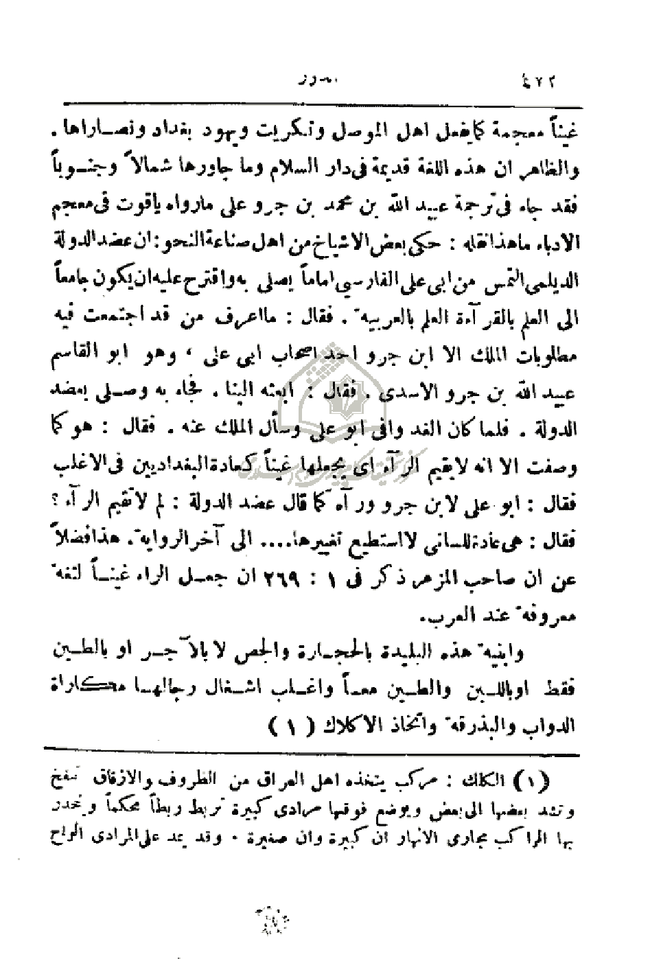 غيناً معجمة كما يفعل أهل الموصل وتكريت ويهود بغداد ونصاراها. والظاهر أن هذه اللغة قديمة في دار السلام وما جاورها شمالاً وجنوباً فقد جاء في ترجمة عبيد الله بن محمد بن جرو على ما رواه ياقوت في معجم الأدباء ما هذا نقله: حكى بعض الأشياخ من أهل صناعة النحو: أن عضد الدولة الدليمي التمس من أبي على الفارسي إماماً يصلي به واقترح عليه أن يكون جامعاً إلى العلم بالقراءة العلم بالعربية. فقال: ما اعرف من قد اجتمعت فيه مطلوبات الملك إلا ابن جرو أحد أصحاب أبي علي، وهو أبو القاسم عبيد الله بن جرو الاسدي. فقال: أبعثه إلينا. فجاء به وصلى بعضد الدولة. فلما كان الغد وافى أبو علي وسأل الملك عنه. فقال: هو كما وصفت إلا انه لا يقيم الراء أي يجعلها غيناً كعادة البغداديين في الأغلب فقال: أبو علي لابن جرو ورآه كما قال عضد الدولة: لم لا تقيم الراء؟ فقال هي عادة للساني لا أستطيع تغييرها. . . . إلى آخر الرواية. فضلاً عن أن صاحب المزهر ذكر في 269: 1