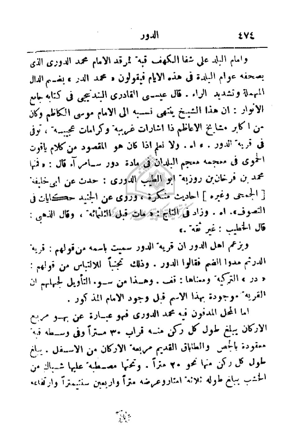 وأمام البلد على شفا الكهف قبة لمرقد الإمام محمد الدوري الذي يصحفه عوام في هذه البلدة في هذه الأيام فيقولون (محمد الدر) بضم الدال المهملة وتشديد الراء. قال عيسى القادري البندنيجي في كتابه جامع الأنوار: أن هذا الشيخ ينتهي نسبه إلى الإمام موسى الكاظم وكان من أكابر مشايخ الأعاظم ذا إشارات غريبة وكرامات عجيبة، توفي في قرية الدور.) اهـ. ولا نعلم إذا كان هو المقصود من كلام ياقوت الحموي في معجمه معجم البلدان في مادة دور سامراء قال: (فمنها محمد بن فرخان بن روزبة أبو الطيب الدوري: حدث عن أبي خليفة (الجمحي وغيره) أحاديث منكرة، وروي عن الجنيد حكايات في التصوف). اهـ. وزاد في التاج: (مات قبل الثلثمائة، وقال الذهبي: قال الخطيب: غير ثقة.)
