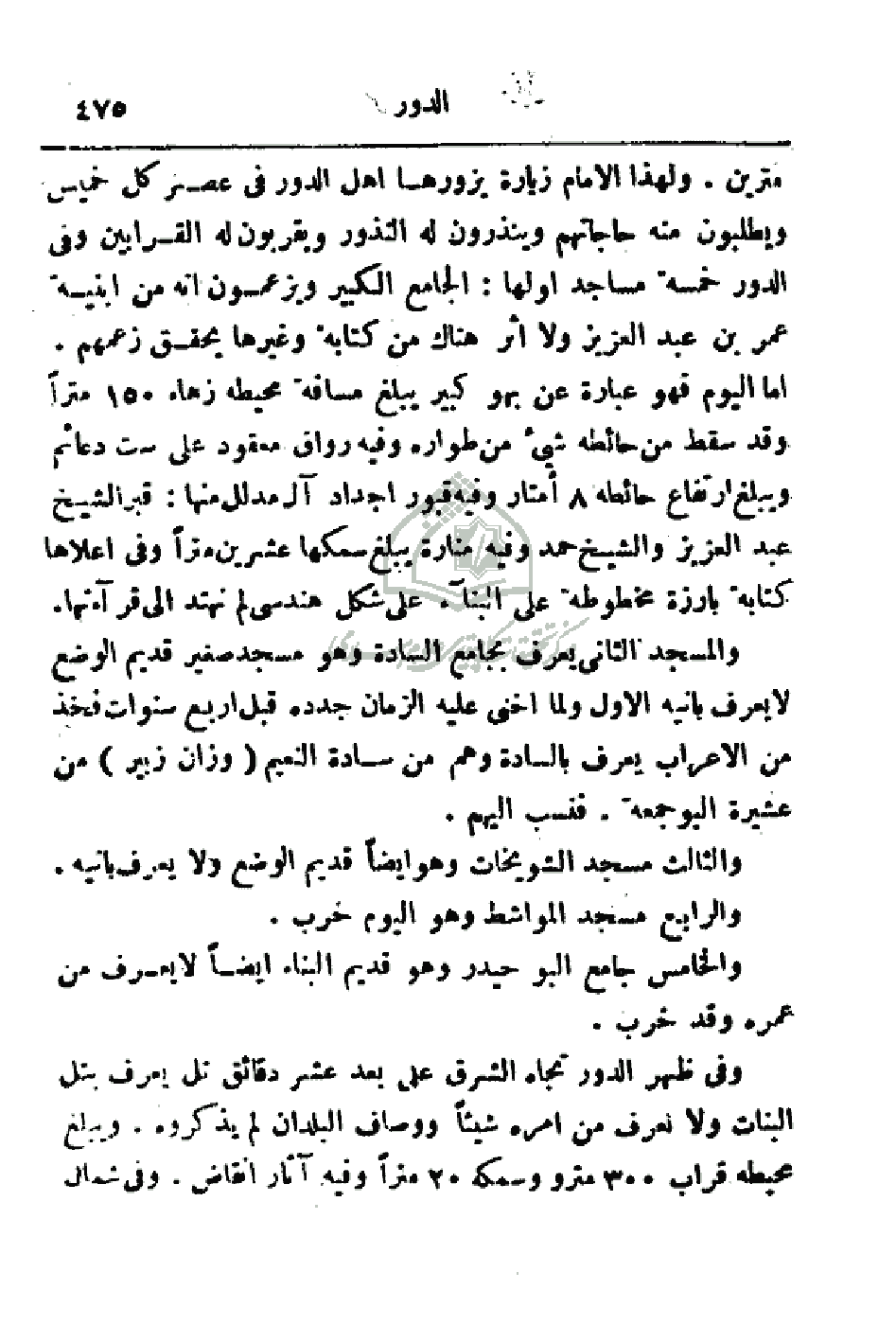 مترين. ولهذا الإمام زيارة يزورها أهل الدور في عصر كل خميس ويطلبون منه حاجاتهم وينذرون له النذور ويقربون القرابين وفي الدور خمسة مساجد أولها: الجامع الكبير ويزعمون انه من أبنية عمر بن عبد العزيز ولا اثر هناك من كتابة وغيرها يحقق زعمهم. أما اليوم فهو عبارة عن بهو كبير مسافة محيطه زهاء 150 متراً وقد سقط من حائطه شيء من طواره وفيه رواق معقود على ست دعائم ويبلغ ارتفاع حائطه 8 أمتار وفيه قبور أجداد آل مدلل منها: قبر الشيخ عبد العزيز والشيخ حمد وفيه منارة يبلغ سمكها عشرين متراً وفي أعلاها كتابة بارزة مخطوطة على