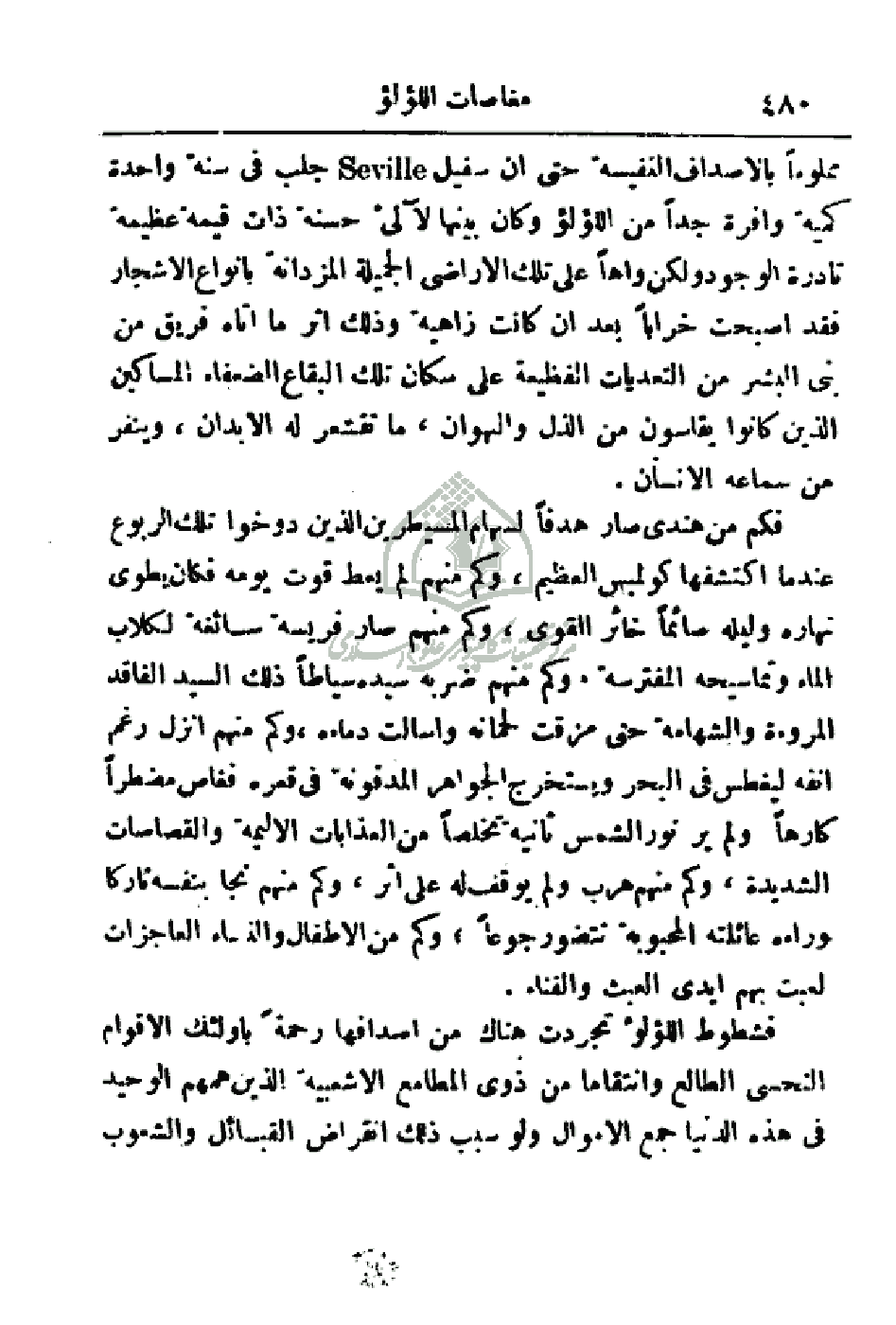 مملوءاً بالأصداف النفيسة حتى أن سفيل جلب في سنة واحدة كمية وافرة جداً من اللؤلؤ وكان بينها لآلئ حسنة ذات قيمة عظيمة قادرة الوجود ولكن واهاً على تلك الأراضي الجميلة المزدانة بأنواع الأشجار فقد أصبحت خراباً بعد أن كانت زاهية وذلك اثر ما آتاه فريق من بني البشر من التعديات الفظيعة على سكان تلك البقاع الضعفاء المساكين الذين كانوا يقاسون من الذل والهوان، ما تقشعر له الأبدان، وينفر من سماعه الإنسان.