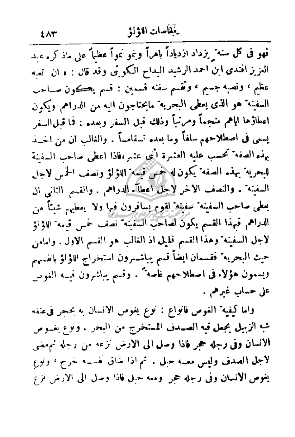 ازدياداً باهراً وينمو نمواً عظيماً على ما ذكره عبد العزيز أفندي ابن احمد الرشيد البداح الكويتي وقد قال: (إن تعبه عظيم، ونصبه جسيم، وتقسم سفنه قسمين: قسم يكون صاحب السفينة هو الذي يعطي البحرية ما تحتاجون إليه من الدراهم ويكون إعطاؤها إياهم منجماً ومرتباً. وذلك قبل السفر وبعده: فما قبل السفر يسمى في اصطلاحهم سلفاً وما بعده تسقاماً. والغالب أن من اخذ بهذه الصفة تحسب عليه العشرة اثني عشر، فإذا أعطى صاحب السفينة للبحرية بهذه الصفة يكون له خمس قيمة اللؤلؤ ونصف الخمس لأجل السفينة. والنصف الآخر لأجل إعطاء الدراهم. والقسم الثاني أن يعطى صاحب السفينة سفينة لقوم يسافرون فيها ولا يعطيهم شيئاً من الدراهم فهذا القسم يكون لصاحب السفينة نصف خمس قيمة اللؤلؤ لأجل السفينة وهذا القسم قليل إذ الغالب هو القسم الأول. وأما من حيث البحرية فقسمان أيضاً قسم يباشرون استخراج اللؤلؤ بأنفسهم ويسمون هؤلاء في اصطلاحهم غاصة. وقسم يباشرون فيه الغوص على حساب غيرهم.