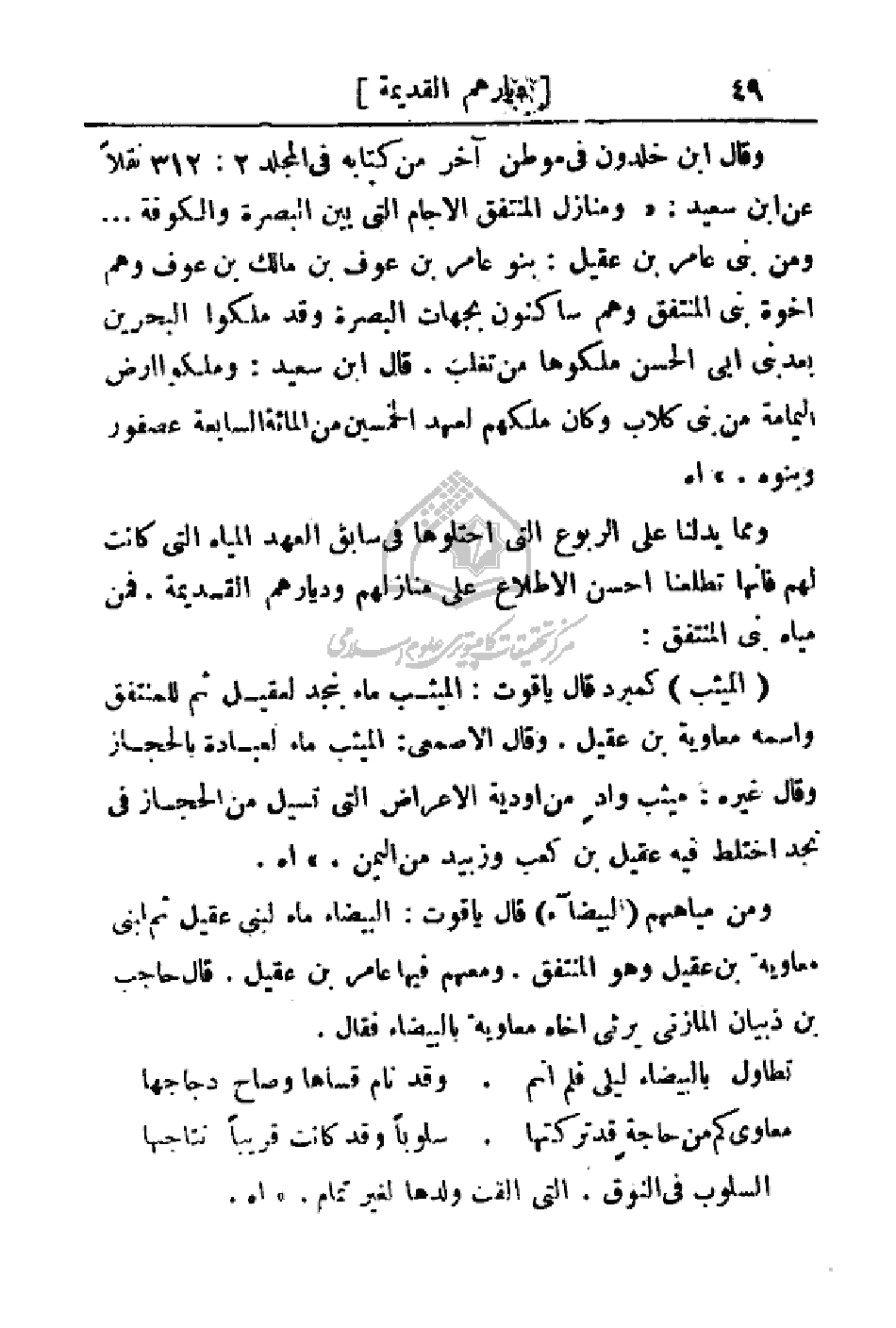 وقال ابن خلدون في موطن آخر من كتابه في المجلد 2: 312 نقلا عن ابن سعيد: (ومنازل المنتفق الآجام التي بين البصرة والكوفة. . . ومن بني عامر بن عقيل: بنو عامر بن عوف بن مالك بن عوف وهم اخوة بني المنتفق وهم ساكنون بجهات البصرة وقد ملكوا البحرين بعد بني أبي الحسن ملكوها من تغلب. قال ابن سعيد: وملكوا أرض اليمامة من بني كلاب وكان ملكهم لعهد الخمسين من المائة السابعة عصفور وبنوه.) اهـ