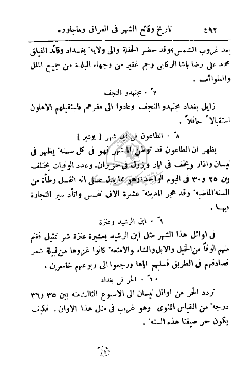 يظهر أن الطاعون قد توطن أبا شهر فهو في كل سنة يظهر في نيسان وآذار ويخف في أيار ويزول في حزيران. وعدد الوفيات يختلف بين 25 و30 في اليوم الواحد، وهو مما يدل على انه اثقل وطأة من السنة الماضية وقد هجر المدينة عشرة آلاف نفس واتأد سير التجارة فيها.