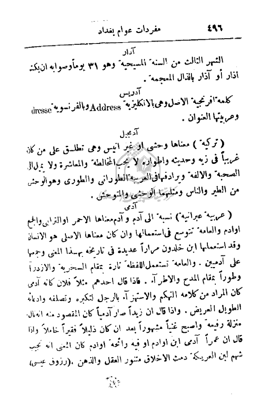 (عربية عبرانية) نسبة إلى آدم وآدم معناها الأحمر أو الترابي والجمع أوادم والعامة تتوسع في استعمالها وان كان معناها الأصلي هو الإنسان وقد استعملها ابن خلدون مراراً عديدة في تاريخه بهذا المعنى وجمعها على آدميين. والعامة تستعمل اللفظة تارة بمقام السخرية والازدراء وطوراً بمقام المدح والإطراء، فإذا قال أحدهم مثلا كأنه ادمي كان المراد من كلامه التهكم والاستهزاء بالرجل لتكبره وتصلفه وادعائه الطويل العريض. وإذا قال أن زيداً صار ادمياً كان المقصود منه انه نال منزلة رفيعة وأصبح غنياً ومشهوراً بعد أن كان ذليلاً فقيراً خاملاً وإذا قال أن عمراً ادمي ابن أوادم أو فيه رائحة أوادم كان المعنى