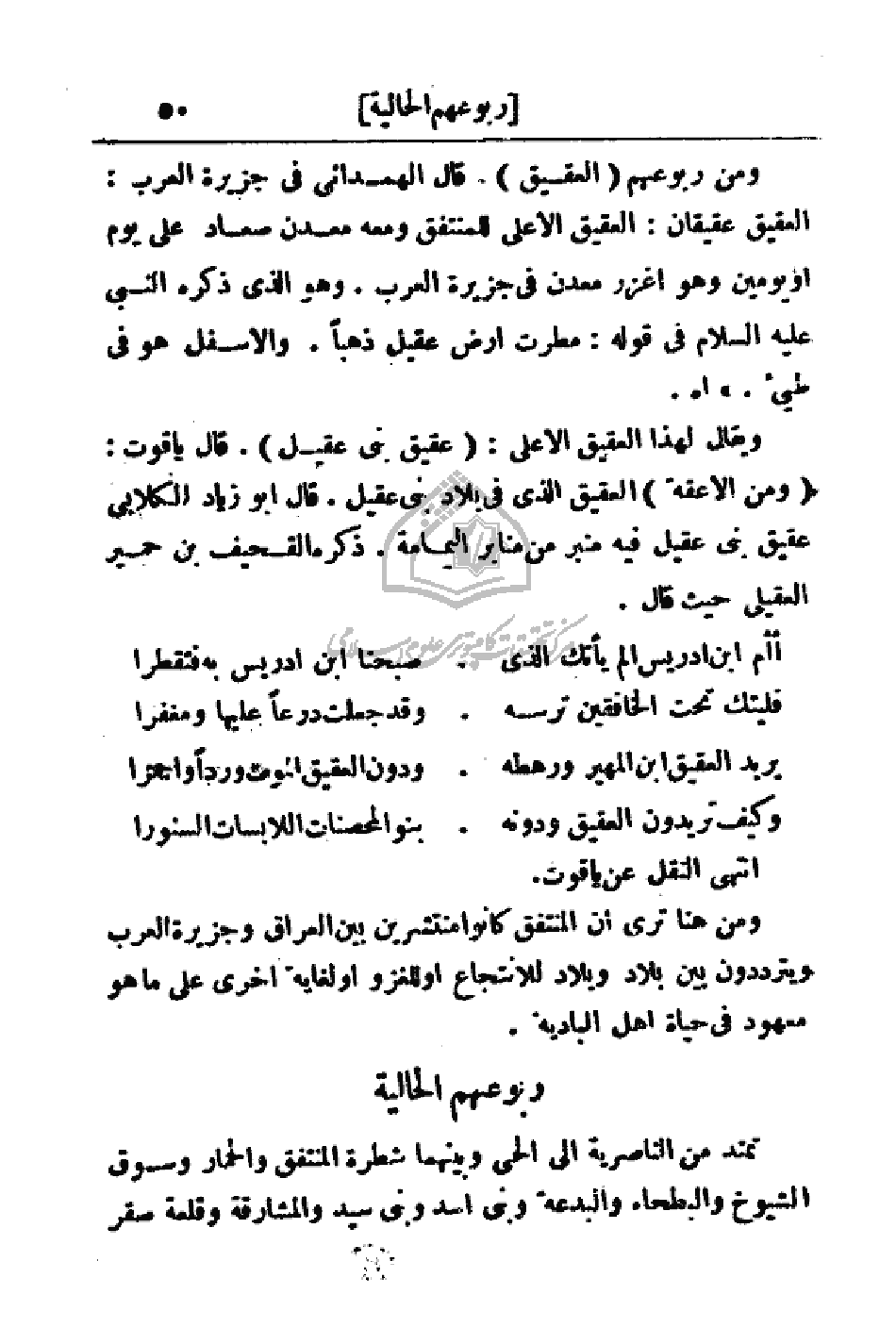 ومن ربوعهم (العقيق) قال الهمداني في جزيرة العرب: العقيق عقيقان: العقيق الأعلى للمنتفق ومعه معدن صعاد على يوم أو يومين وهو اغزر معدن في الجزيرة العرب. وهو الذي ذكره النبي عليه السلام في قوله: مطرت أرض عقيل ذهباً. والأسفل هو في طي.) اهـ
