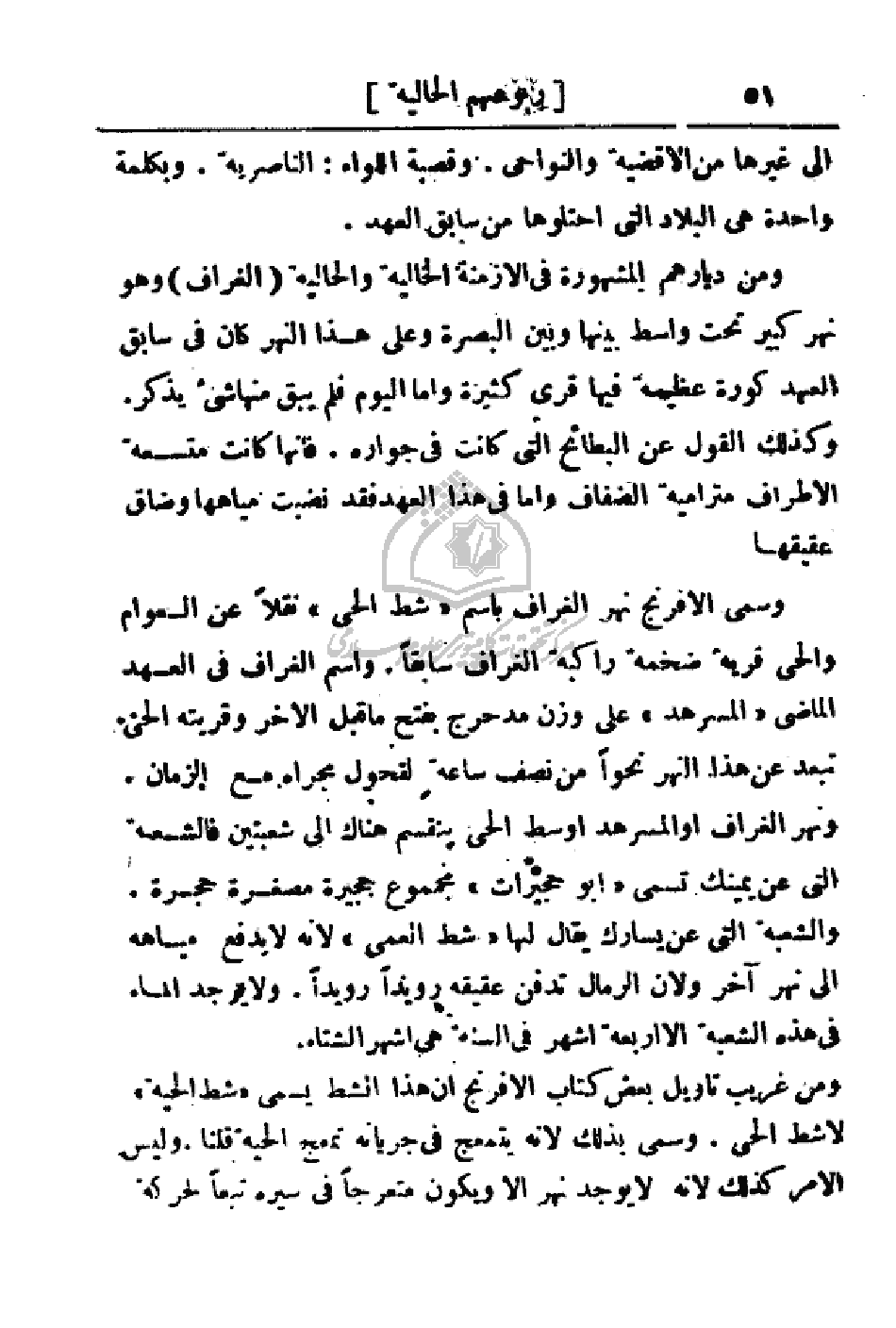 وسمى الإفرنج نهر الغراف باسم (شط الحي) نقلاً عن العوام والحي قرية ضخمة راكبة الغراف سابقاً. واسم الغراف في العهد الماضي (المسرهد) على وزن مدحرج بفتح ما قبل الآخر وقريته الحي تبعد عن هذا النهر نحواً من نصف ساعةٍ لتحول مجراه مع الزمان. ونهر الغراف أو المسرهد أو شط الحي ينقسم هناك إلى شعبتين فالشعبة التي عن يمينك تسمى (أبو حجيرات) مجموع حجيرة مصغرة حجرة. والشعبة التي عن يسارك يقال لها (شط العمى) لأنه لا يدفع مياهه إلى نهر آخر ولان الرمال تدفن عقيقه رويداً رويداً. ولا يوجد الماء في شعبة إلا أربعة أشهر في السنة هي أشهر الشتاء.
