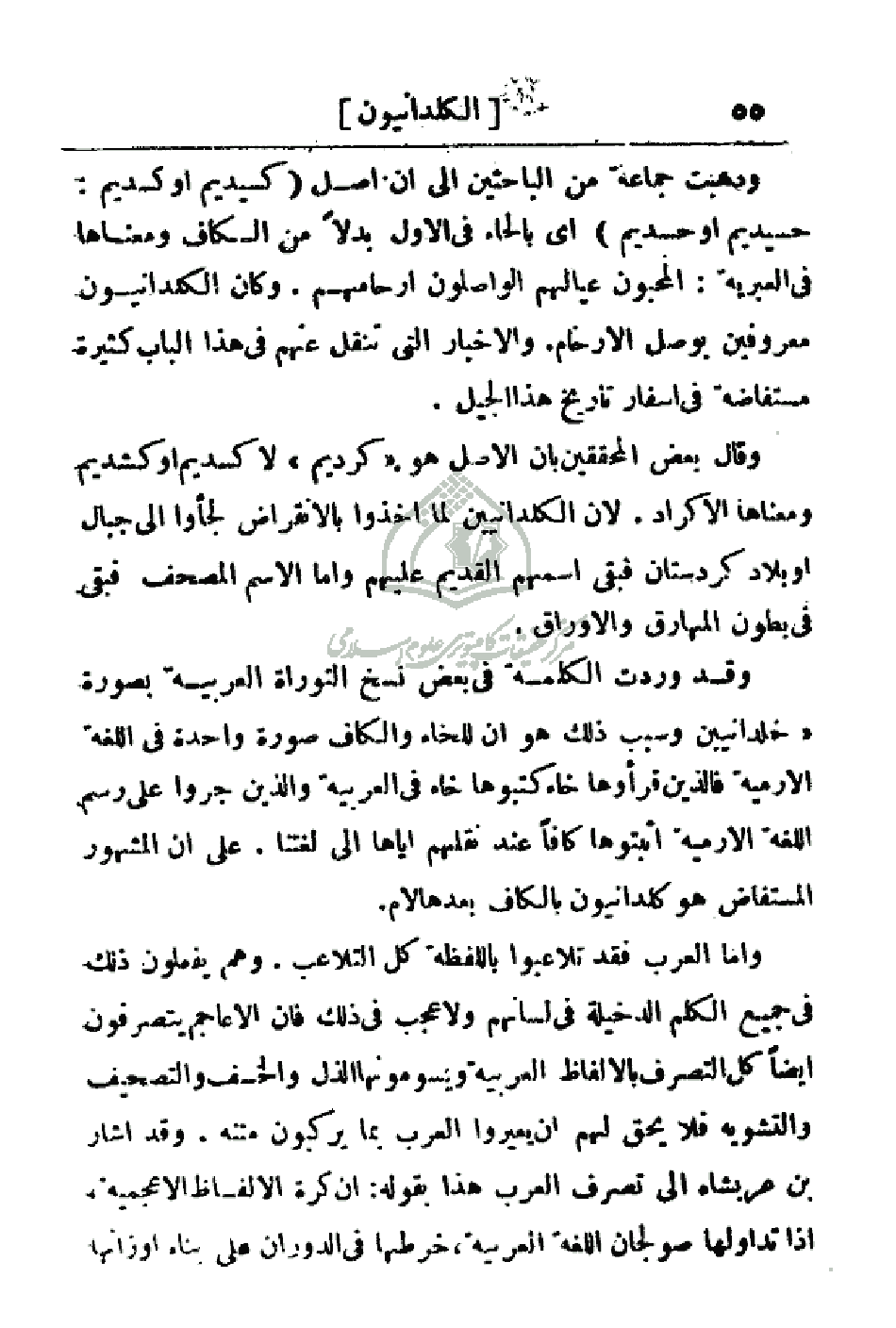جروا على رسم اللغة الارمية أثبتوها كافا عند نقلهم إياها إلى لغتنا. على أن المشهور المستفاض هو كلدانيون بالكاف بعدها لام.