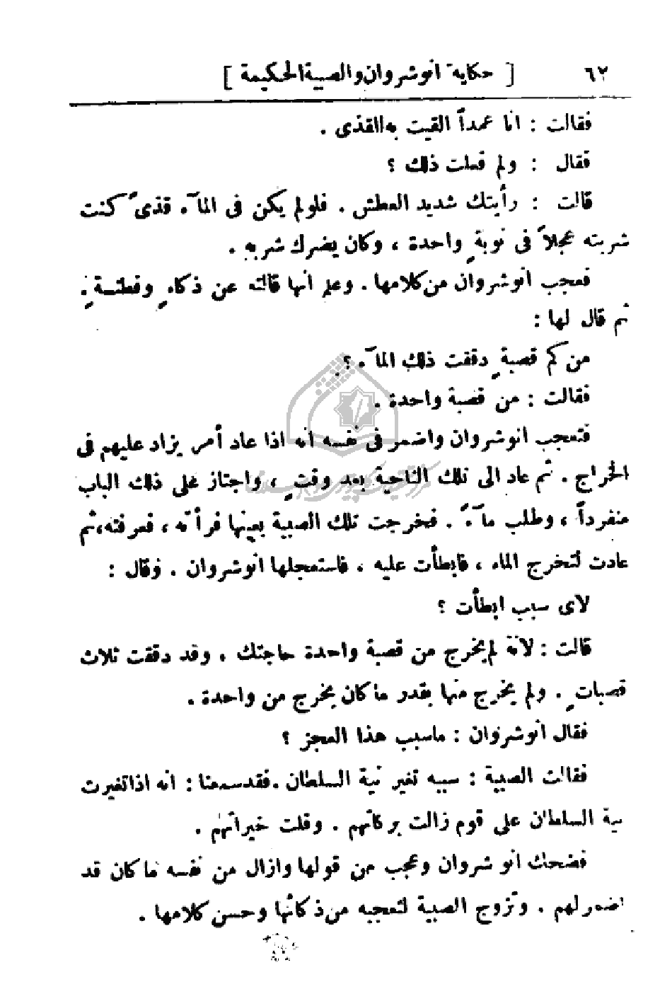 فعجب انوشروان من كلامها. وعلم إنها قالته عن ذكاءٍ وفطنةٍ.
