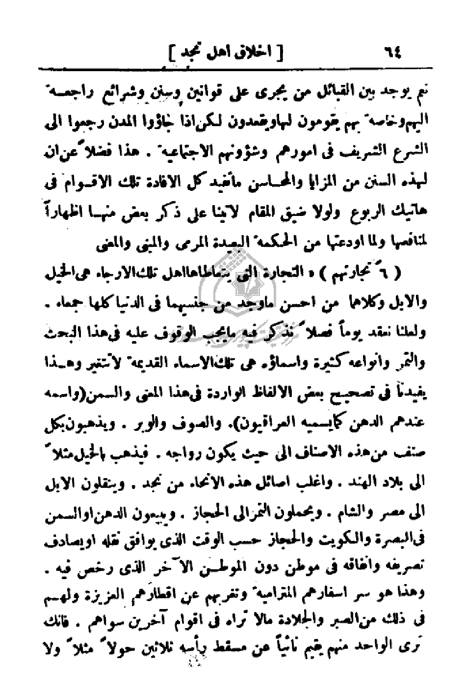 (6 جارتهم) (التجارة التي يتعاطاها أهل تلك الأرجاء هي الخيل والإبل وكلاهما من احسن ما وجد من جنسيهما في الدنيا كلها جمعاء. ولعلنا نعقد يوما فصلاً نذكر فيه ما يجب الوقوف عليه في البحث والتمر وأنواعه كثيرة وأسماؤه هي تلك الأسماء القديمة لا تتغير وهذا يفيدنا في تصحيح بعض الألفاظ الواردة في هذا المعنى والسمن (واسمه عندهم الدهن كما يسميه العراقيون) والصوف والوبر. ويذهبون بكل صنف من هذه الأصناف إلى حيث يكون رواجه. فيذهب بالخيل مثلا إلى بلاد الهند. واغلب أصائل هذه الأنحاء من نجد. وينقلون الإبل إلى مصر والشام. ويحملون التمر إلى الحجاز. ويبيعون الدهن أو السن في البصرة والكويت والحجاز حسب الوقت الذي يوافق نقله أو يصادف تصريفه وإنفاقه في موطن دون الموطن الآخر الذي رخص فيه. وهذا هو سر أسفارهم المترامية وتغريهم عن أقطارهم العزيزة ولهم في ذلك من الصبر والجلادة مالا تراه في أقوام آخرين سواهم. فانك ترى الواحد منهم يقيم نائباً عن مسقط رأسه ثلاثين حولاً مثلاً ولا