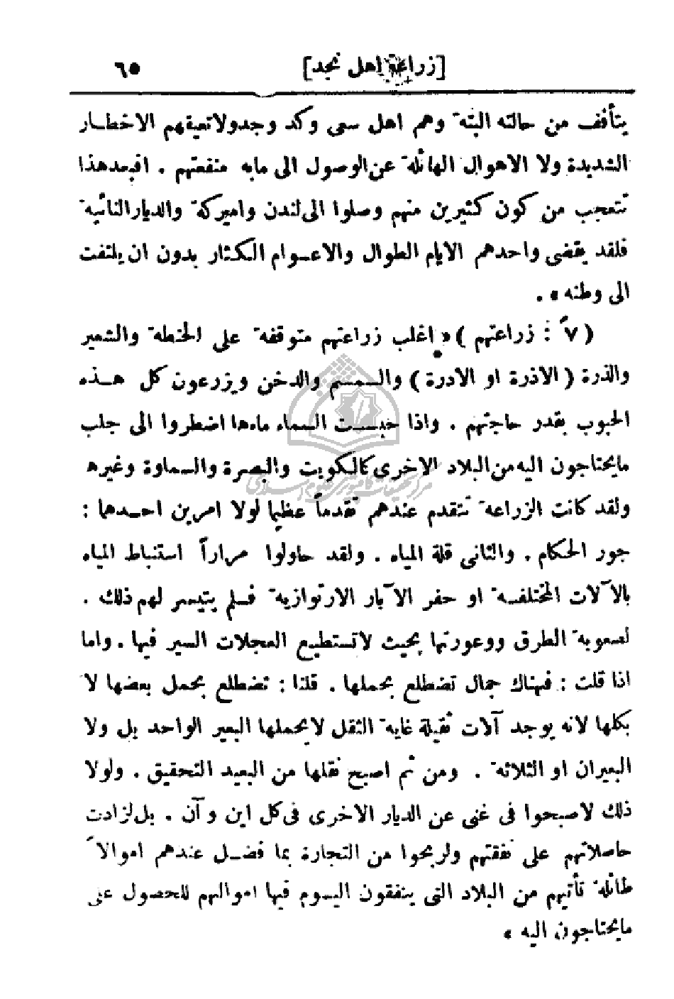 والسمسم والدخن ويزرعون كل هذه الحبوب بقدر حاجتهم. وإذا حبست السماء ماءها اضطروا إلى جلب ما يحتاجون إليه من البلاد الأخرى كالكويت والبصرة والسماوة وغيرها ولقد كانت الزراعة تتقدم عندهم تقدما عظيما لولا أمرين أحدهما: جور الحكام. والثاني قلة المياه. ولقد حاولوا مرارا استنباط المياه بالآلات المختلفة أو حفر الآبار الارتوازية فلم يتيسر لهم ذلك. لصعوبة الطرق ووعورتها بحيث لا تستطيع العجلات السير فيها. وأما إذا قلت: فهناك جمال تضطلع بحملها. قلنا: تضطلع بحمل بعضها لا بكلها لأنه يوجد آلات ثقيلة غاية الثقل لا يحملها البعير الواحد بل ولا البعيران أو الثلاثة. ومن ثم أصبح نقلها من البعيد التحقيق. ولولا ذلك لأصبحوا في غنى عن الديار الأخرى في كل أين وان. بل لزادت حاصلاتهم على نفقتهم ولربحوا من التجارة بما فضل عندهم أموالاً طائلة تأتيهم من البلاد التي ينفقون اليوم فيها أموالهم للحصول على ما يحتاجون إليه.