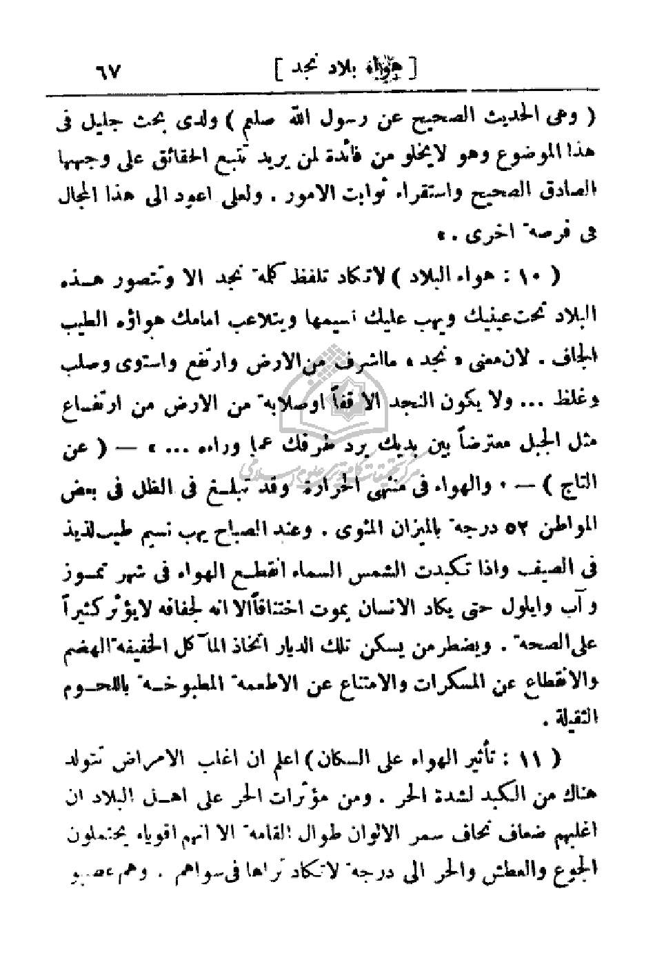 (10: هواء البلاد) لا تكاد تلفظ كله نجد إلا وتتصور هذه البلاد تحت عينيك ويهب عليك نسيمها ويتلاعب أمامك هواؤه الطيب الجاف. لان معنى (نجد) ما اشرف من الأرض وارتفع واستوى وصلب وغلظ. . . ولا يكون النجد إلا قفاً أو صلابة من الأرض من ارتفاع مثل الجبل معترضا بين يديك يرد طرفك عما وراءه. . .) - (عن التاج) -، والهواء في منتهى الحرارة وقد تبلغ في الظل في بعض المواطن 52 درجة بالميزان المئوي. وعند الصباح يهب نسيم طيب لذيذ في الصيف وإذا تكبدت الشمس السماء انقطع الهواء في شهر تموز وأب وأيلول حتى يكاد الإنسان يموت اختناقا إلا انه لجفافه لا يؤثر كثيرا على الصحة. ويضطر من يسكن تلك الديار اتخاذ المآكل الخفيفة الهضم والانقطاع عن المسكرات والامتناع عن الأطعمة المطبوخة باللحوم الثقيلة.
