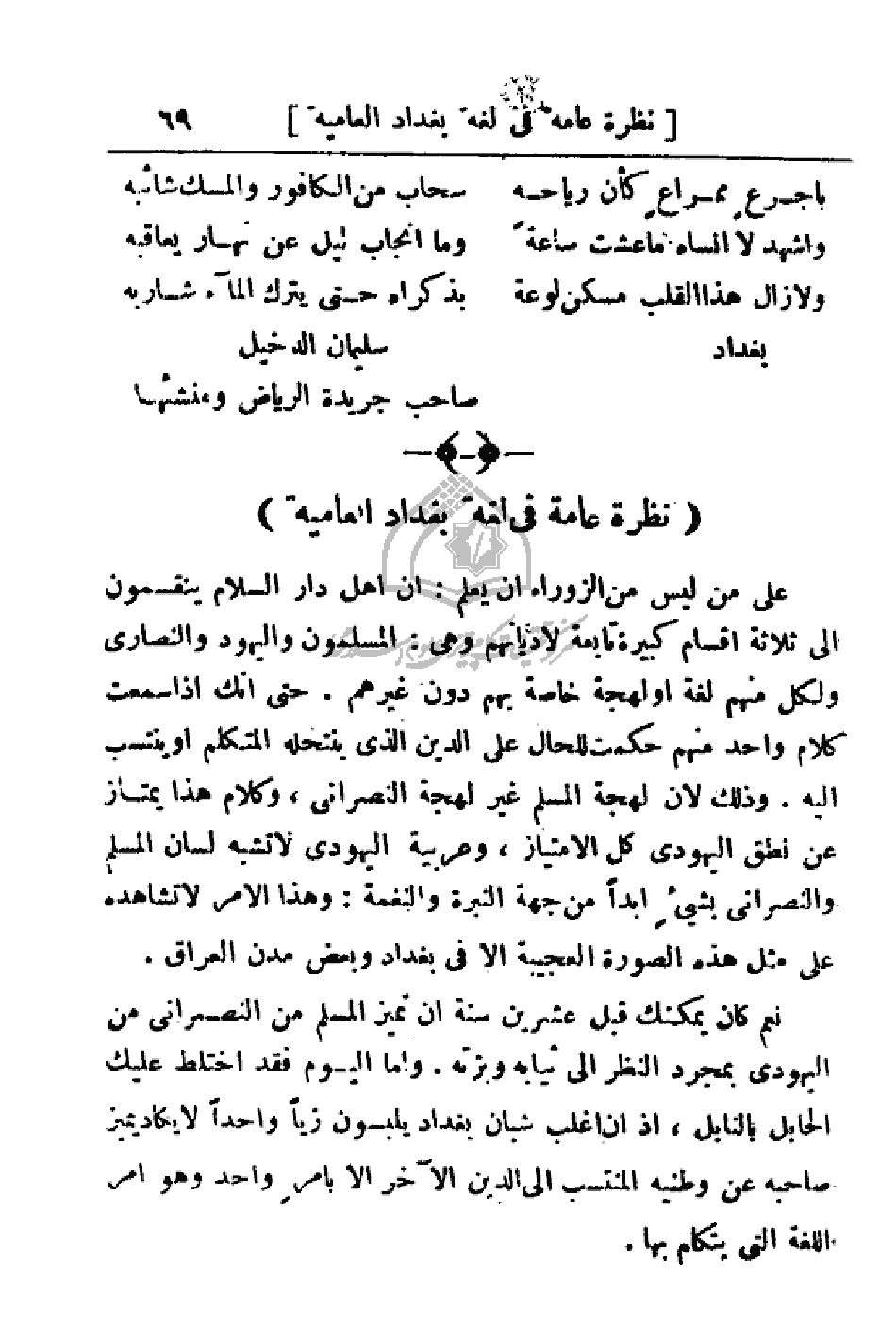 على من ليس من الزوراء أن يعلم: أن أهل دار السلام ينقسمون إلى ثلاثة أقسام كبيرة تابعة لأديانهم وهي: المسلمون واليهود والنصارى ولكل منهم لغة أو لهجة خاصة بهم دون غيرهم. حتى انك إذا سمعت كلام واحد منهم حكمت للحال على الدين الذي ينتحله المتكلم أو ينتسب إليه. وذلك لان لهجة المسلم غير لهجة النصراني، وكلام هذا يمتاز عن نطق اليهودي كل الامتياز، عربية اليهودي لا تشبه لسان المسلم والنصراني بشيء أبداً من جهة النبرة والنغمة: وهذا الأمر لا تشاهده على مثل هذه الصورة العجيبة إلا في بغداد وبعض مدن العراق.