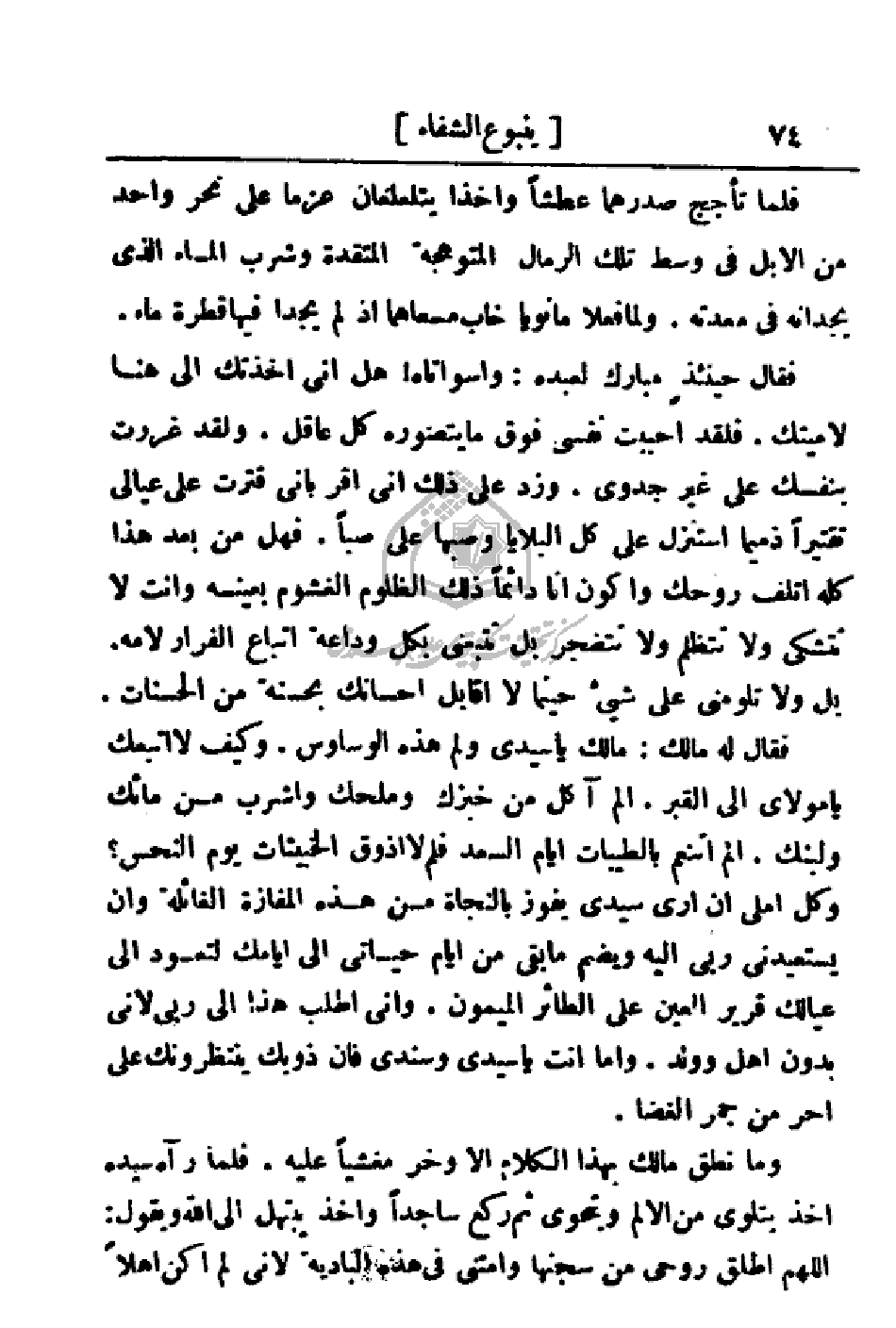 فقال له مالك: مالك يا سيدي ولم هذه الوساوس. وكيف لا اتبعك يا مولاي إلى القبر. ألم أكل من خبزك وملحك واشرب من ماءك ولبنك. ألم أتتنعم بالطيبات أيام السعد فلم لا أذوق الخبيثات يوم النحس؟ وكل أملي أن أرى سيدي يفوز بالنجاة من هذه المفازة الغائلة وان يستعيدني ربي إليه ويضم ما بقي من أيام حياتي إلى أيامك لتعود إلى عيالك قرير العين على الطائر الميمون. وأني اطلب هذا إلى ربي لأني بدون أهل وولد. وأما أنت وسندي فان ذويك ينتظرونك على أحر من جمر الغضا.