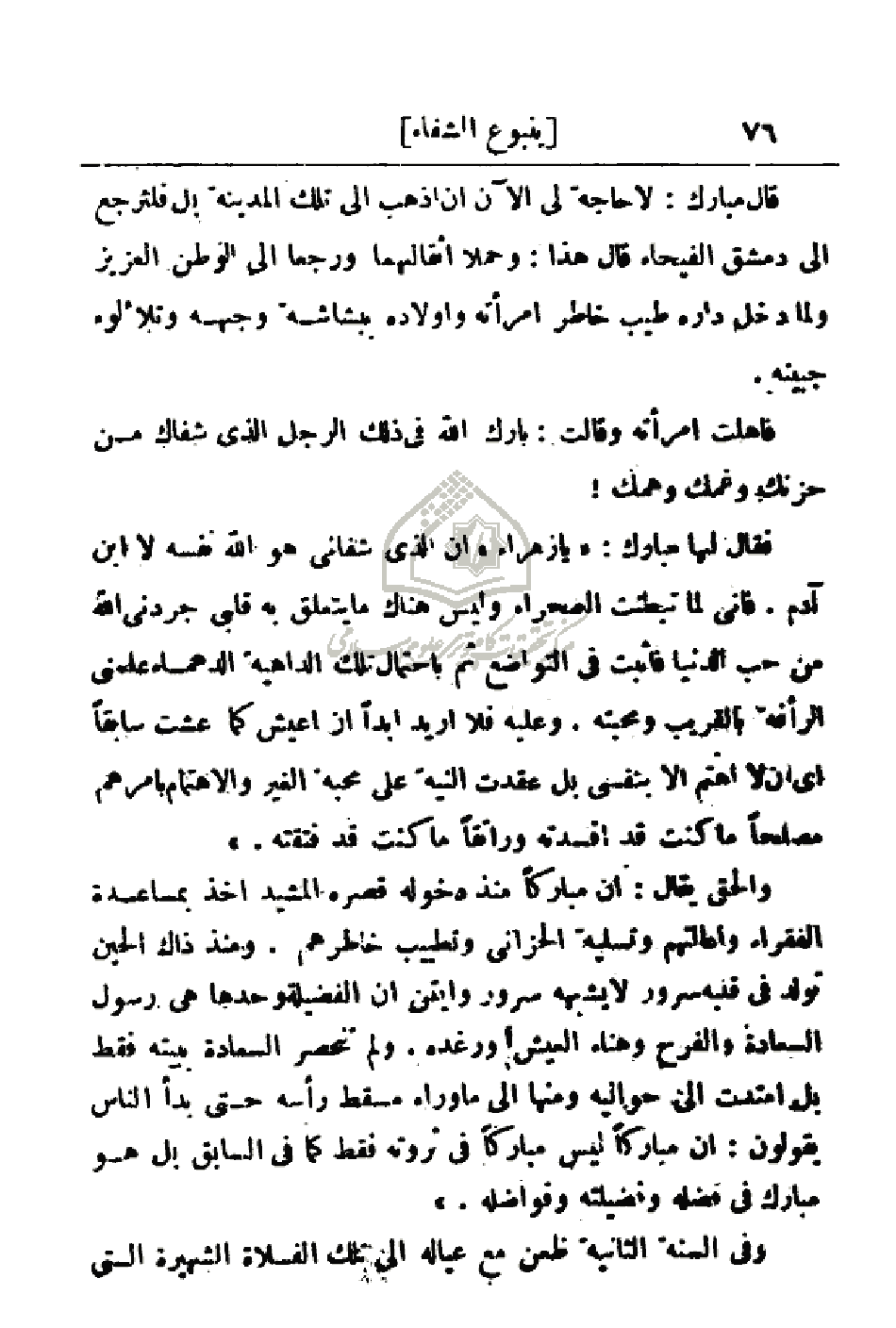 الحزانى وتطييب خاطرهم. ومنذ ذاك الحين تولد في قلبه سرور لا يشبه سرور وأيقن أن الفضيلة وحدها هي رسول السعادة والفرح وهناء العيش ورغده. ولم تنحصر السعادة ببيته فقط بل امتدت إلى حواليه ومنها إلى ما وراء مسقط رأسه حتى بدا الناس يقولون: أن مباركاً ليس مباركاً في ثروته فقط كما في السابق بل هو مبارك في فضله وفضيلته وفواضله.)