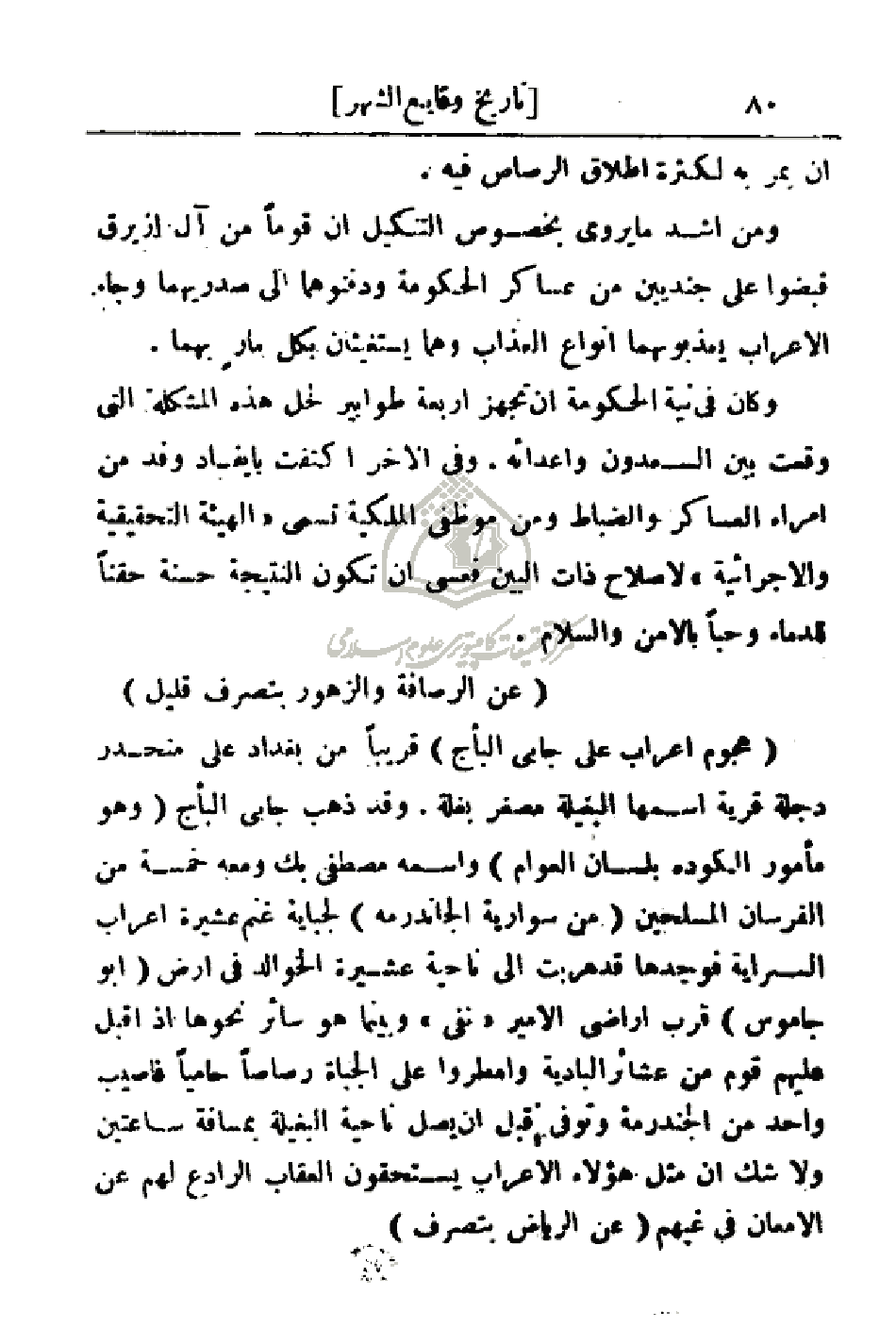 (هجوم أعراب على جابي البأج) قريباً من بغداد على منحدر دجلة قرية اسمها البغيلة مصغر بغلة. وقد ذهب جاب البأج (وهو مأمور الكودة بلسان العوام) واسمه مصطفى بك ومعه خمسة من الفرسان المسلحين (من سواريه الجادنرمه) لجباية غنم عشيرة أعراب السراية فوجدها قد هربت إلى ناحية عشيرة الخوالد في أرض (أبو جاموس) قرب أراضي الأمير (نفي) وبينما هو سائر نحوها إذ اقبل عليهم قوم من عشائر البادية وأمطروا على الجباة رصاصاً حامياً فأصيب واحد من الجندرمة وتوفي قبل أن يصل ناحية البغيلة بمسافة ساعتين ولا شك أن مثل هؤلاء الأعراب يستحقون العقاب الرادع لهم عن الإمعان في غيهم (عن الرياض بتصرف)