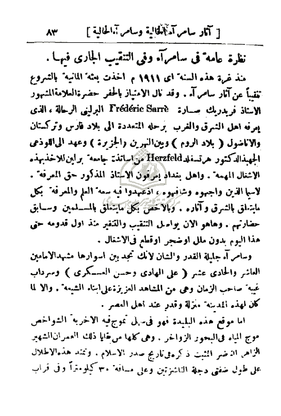 منذ غرة هذه السنة أي 1911 م أخذت بعثة ألمانية بالشروع تنقيبا عن آثار سامراء. وقد نال الامتيازبالحفر حضرة العلامة المشهور الأستاذ فريدريك صارة البرليني الرحالة، الذي يعرفه أهل المشرق والغرب برحله المتعددة إلى بلاد فارس وتركستان والأناضول