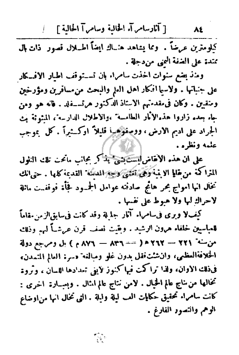 ومنذ بضع سنوات أخذت سامراء بان تستوقف أطيار الأفكار على جنباتها. ولا سيما أفكار أهل العلم والبحث من مسافرين ومؤرخين ومنقبين. وكان في مقدمتهم الأستاذ الدكتور هرتسفلد. فانه هو ومن جاء بعده زاروا هذه الآثار الطامسة، والأطلال الدارسة، والمبثوثة بث الجراد على أديم الأرض، ووصفوها قليلاً أو كثيراً. كل بموجب علمه ونظره.