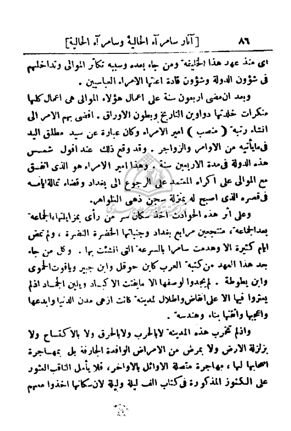 وعلى اثر هذه الحوادث اخذ سكان سر من رأى بمزايلتها، الجماعة بعد الجماعة، منتجعين مرابع بغداد وجنباتها الخضرة النضرة، ولم تمض أيام كثيرة إلا وهدمت سامرا بالسرعة التي فنشئت بها. وكل من جاء بعد هذا العهد من كتبه العرب كابن حوقل وابن جبير وياقوت الحموي وابن بطوطة. لم يجدوا لوصفها إلا ما يفتت الأكباد ويلين الجماد إذ لم يعثروا فيها إلا على أنقاض وأطلال لمدينة كانت أزهى مدن الدنيا وأبدعها وأعجبها وأتقنها بناء وهندسة.