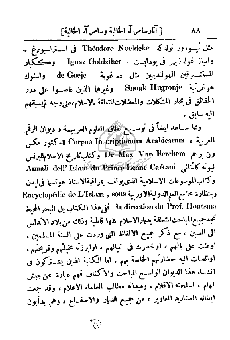 ومما ساعد أيضاً في توسيع نطاق العلوم العربية (ديوان الرقم العربية) للدكتور مكس ون برحم وكتاب تاريخ الإسلام للبرنس ليونه كائتاني وكتاب الموسوعات الإسلامية الذي يولف بمراقبة الأستاذ هوتسما في ليدن وبنظارة مجامع العلم الدولية الأوربية ففي هذا الكتاب بل البحر المحيط تجد جميع المباحث المتعلقة بديار الإسلام كلها قاطبة وذلك من بلاد الأندلس إلى الصين، مع ذكر جميع الألفاظ التي وردت على السنة المسلمين، أوعنت على بالهم، أو خطرت في خيالهم، أو أبرزته مخيلتهم وقريحتهم، أو اتصلت إليه حضارتهم الخاصة بهم. أما الكتبة الذين يشتركون في إنشاء هذا الديوان الواسع المباحث والأكناف فهم عبارة عن جيش لهام، أسلحته الأقلام، وميدانه مطالب العلماء الأعلام، وقد جمعت أبطاله الصناديد المغاوير، من جميع الديار والأصقاع، وهم يدأبون