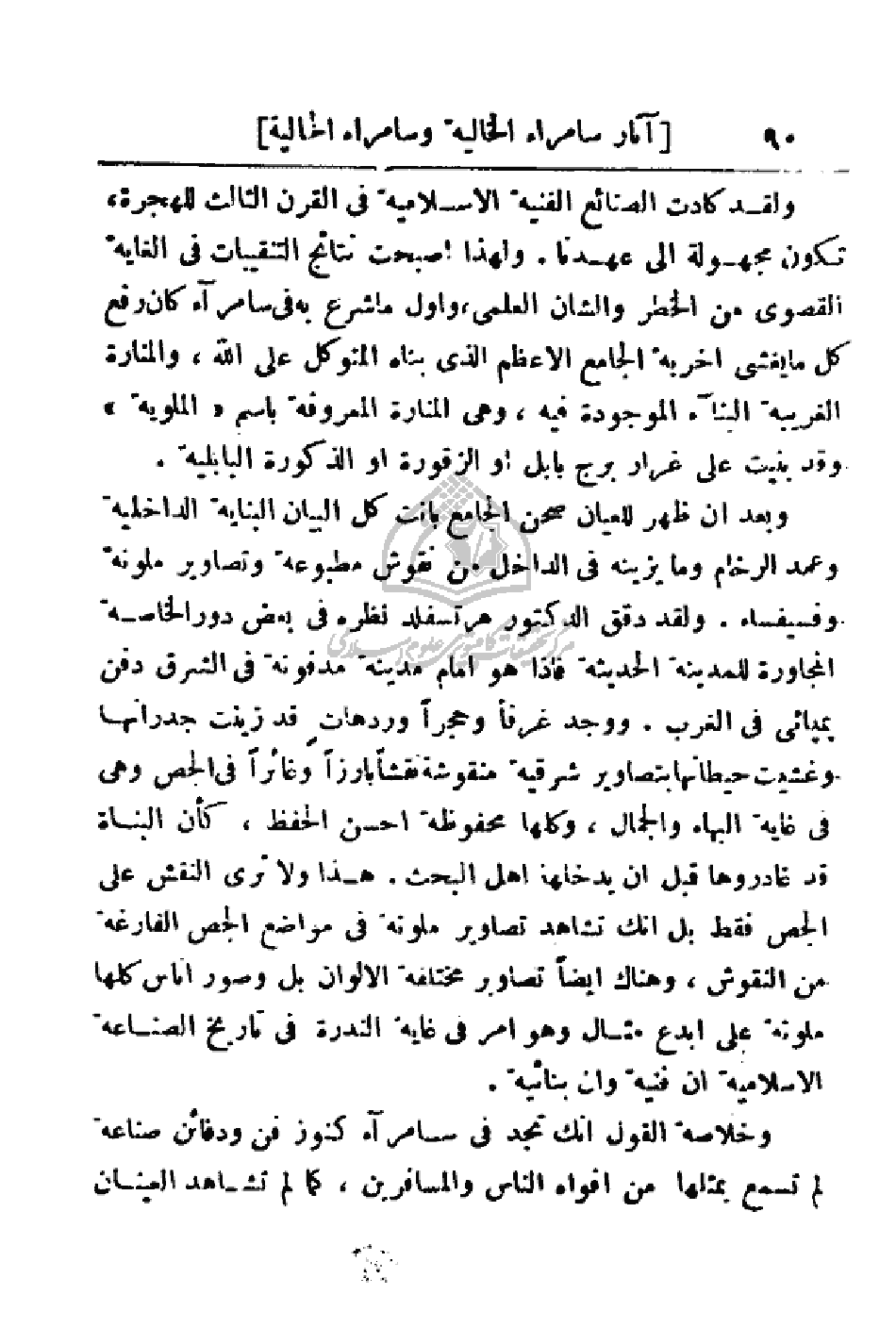 وخلاصة القول انك تجد في سامراء كنوز فن ودفائن صناعة لم تسمع يمثلها من أفواه الناس والمسافرين، كما لم تشاهد العينان