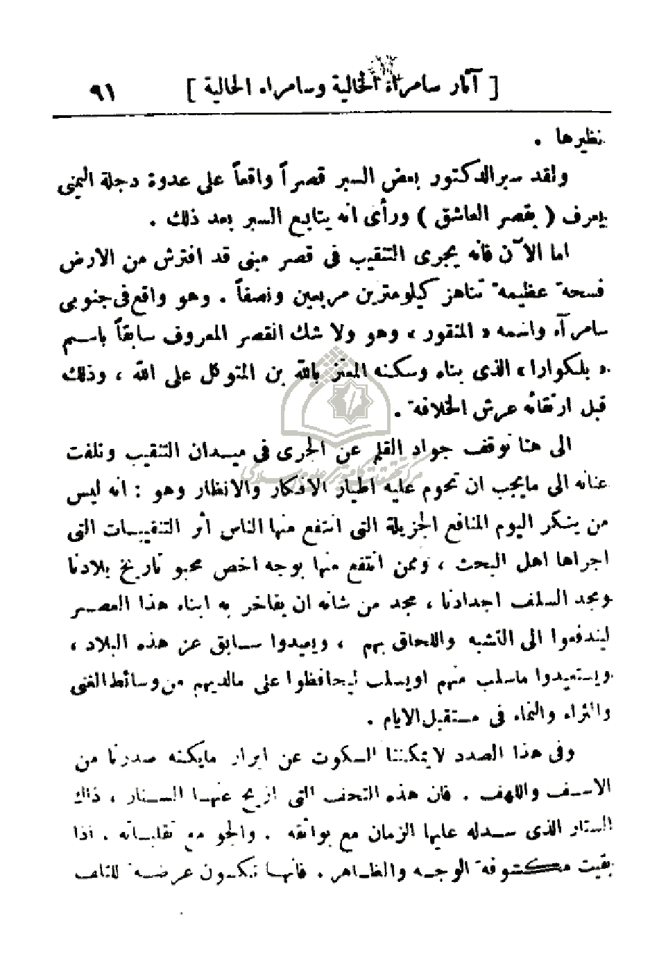 ولقد سبر الدكتور بعض السير قصراً واقعاً على عدوة دجلة اليمنى يعرف (بقصر العاشق) ورأى انه يتابع السير بعد ذلك.