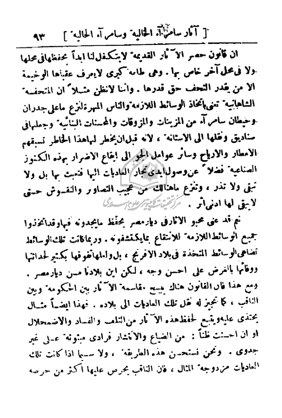 نعم قد عني محبو الآثار في ديار مصر بحفظ ما يجدونه فيها وقد اخذوا جميع الوسائط اللازمة للانتفاع بما يكتشفونه. وربما كانت تلك الوسائط تضاهي الوسائط المتخذة في بلاد الافرنج، بل ولعلها تفوقها بكثير لحداثتها ووفائها بالغرض على احسن وجه، لكن أين بلادنا من ديار مصر. ومع هذا فان القانون هناك يبيح مقاسمة الآثار بين الحكومة وبين الناقب، كما تحبير له نقل الآثار العاديات إلى بلاده. فهذا أيضاً مثال يحتذي عليه ويتبع لحفظ هذه الآثار من التلف والفساد والاضمحلال أو أن أحسنت ظناً: من الضياع والانتشار فرادى مبثوثة على غير جدوى. ونحن نستحسن هذه الطريقة، ولا سيما إذا كانت تلك العاديات مزدوجة المثال، فان الناقب يحرص عليها اكثر من حرصه