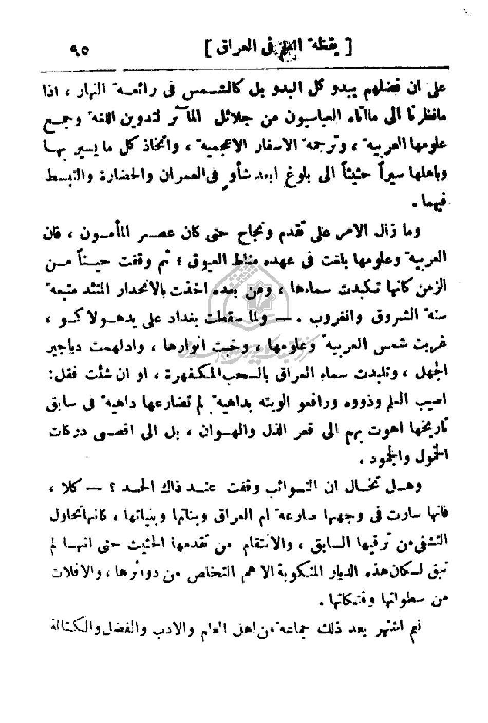 وما زال الأمر على تقدم ونجاح حتى عصر المأمون، فان العربية وعلومها بلغت في عهده مناط العيوق، ثم وقفت حيناً من الزمن كأنها تكبدت سماءها، ومن بعده أخذت بالانحدار المتئد متبعة سنة الشروق والغروب. - ولما سقطت بغداد على يد هولاكو، غربت شمس العربية وعلومها، وخبت انوارها، وادلهمت دياجير الجهل، وتلبدت سماء العراق بالسحب المكفهرة، أو أن شئت فقل: أصيب العلم وذووه ورافعو ألويته بداهية لم تضارعها داهية في سابق تاريخها أهوت بهم إلى قعر الذل والهوان، بل إلى أقصى دركات الخمول والجمود.