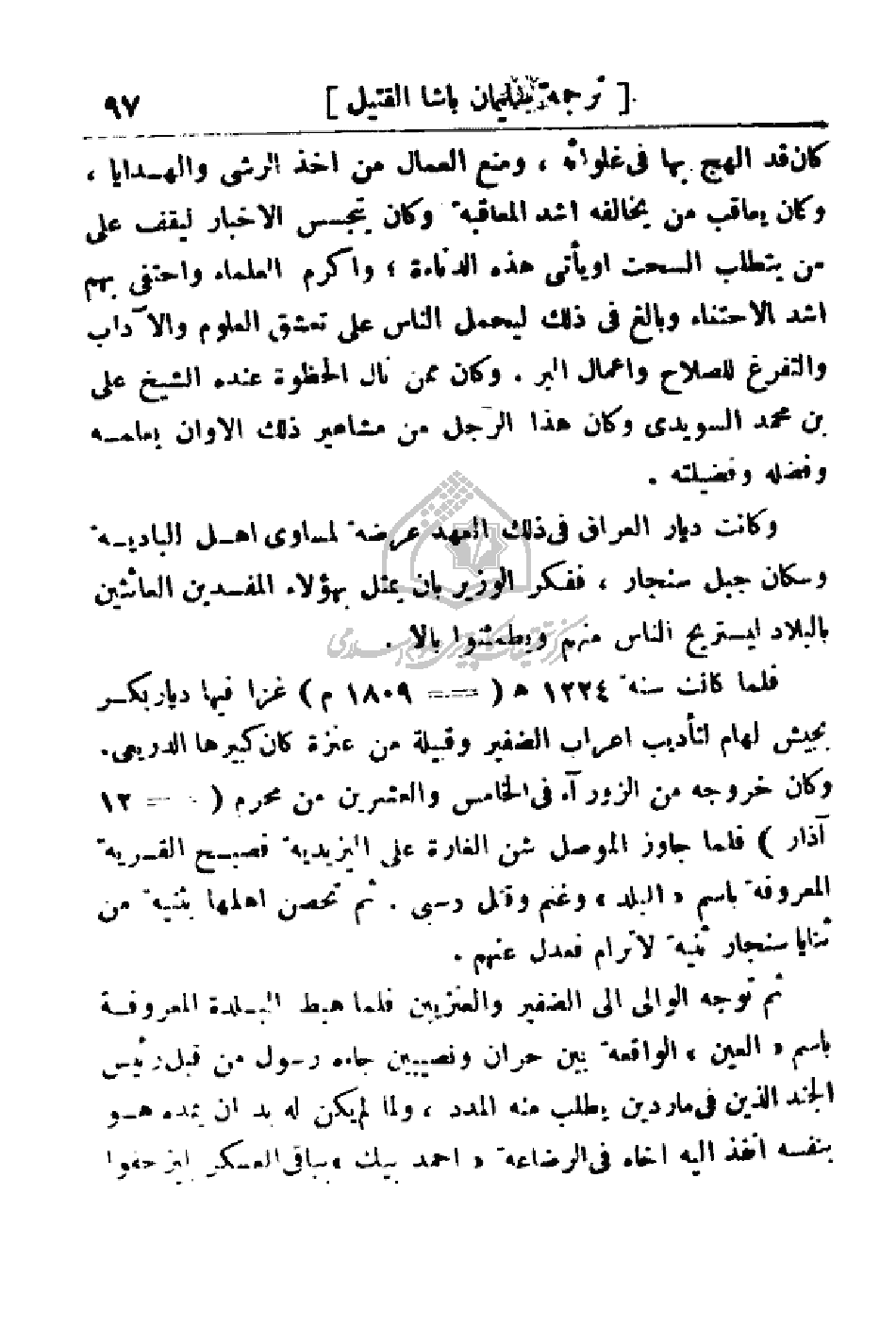 فلما كانت سنة 1224هـ (1809 م) غزا فيها ديار بكر بجيش لهام لتأديب أعراب الضفير وقبيلة من عنزة كان كبيرها الدريعي. وكان خروجه من الزوراء في الخامس والعشرين من محرم (12 آذار) فلما جاوز الموصل شن الغارة على اليزيدية فصبح القرية المعروفة باسم (البلد) وغنم وقتل وسبى. ثم تحصن أهلها بثنية من ثنايا سنجار ثنية لا تراهم فعدل عنهم.