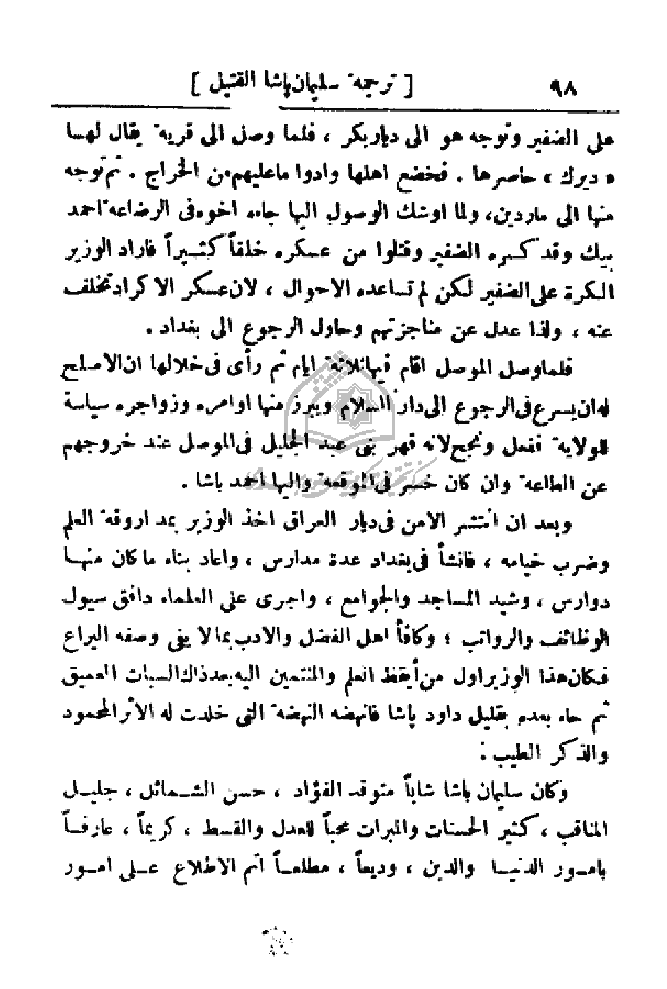وكان سليمان باشا شاباً متوقد الفؤاد، حسن الشمائل، جليل المناقب، كثير الحسنات والميزات محباً للعدل والقسط، كريماً، عارفاً بأمور الدنيا والدين، وديعاً، مطلعاً أتم الاطلاع على أمور