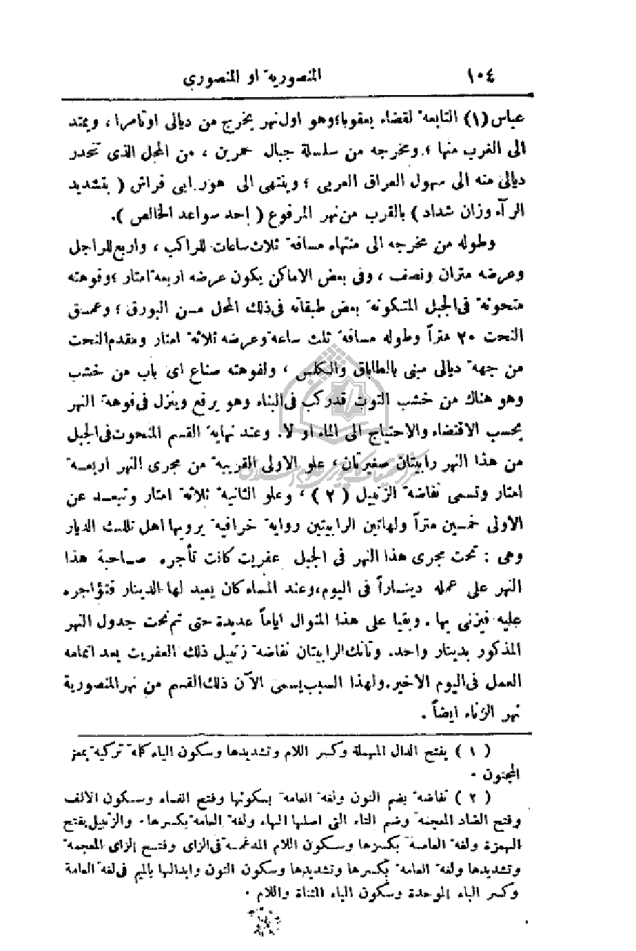 وطوله من مخرجه إلى منتهاه مسافة ثلاث ساعات للراكب، وأربع للراجل وعرضه متران ونصف، وفي بعض الأماكن يكون عرضه أربعة أمتار؛ وفوهته منحوته في الجبل المتكونة بعض طبقاته في ذلك المحل من البورق؛ وعمق النحت 20 متراً وطوله مسافة ثلث ساعة وعرضه ثلاثة أمتار ومقدم النحت من جهة ديالى مبني بالطاباق والكلس، ولفوهته صناع أي باب من خشب وهو هناك من خشب التوت قد ركب في البناء وهو يرفع وينزل في فوهة النهر بحسب الاقتضاء والاحتياج إلى الماء أو لا. وعند نهاية القسم المنحوت في الجبل من هذا النهر رابيتان صغيرتان، علو الأولى القريبة من مجرى النهر أربعة أمتار وتسمى نفاضة الزنبيل، وعلو الثانية ثلاثة أمتار وتبعد عن الأولى خمسين متراً ولهاتين الرابيتين رواية خرافية يرويها أهل تلك الديار وهي: تحت مجرى هذا النهر في الجبل عفريت كانت تأجره صاحبة هذا النهر على عمله ديناراً في اليوم، وعند المساء كان يعيد لها الدينار فتؤاجره عليه فيزنى بها. وبقيا على هذا المنوال أياماً عديدة حتى تم نحت جدول النهر المذكور بدينار واحد. وتانك الرابيتان نفاضة زنبيل ذلك العفريت بعد إتمامه العمل في اليوم الأخير. ولهذا السبب يسمى الآن ذلك القسم من نهر المنصورية نهر الزناء أيضاً.
