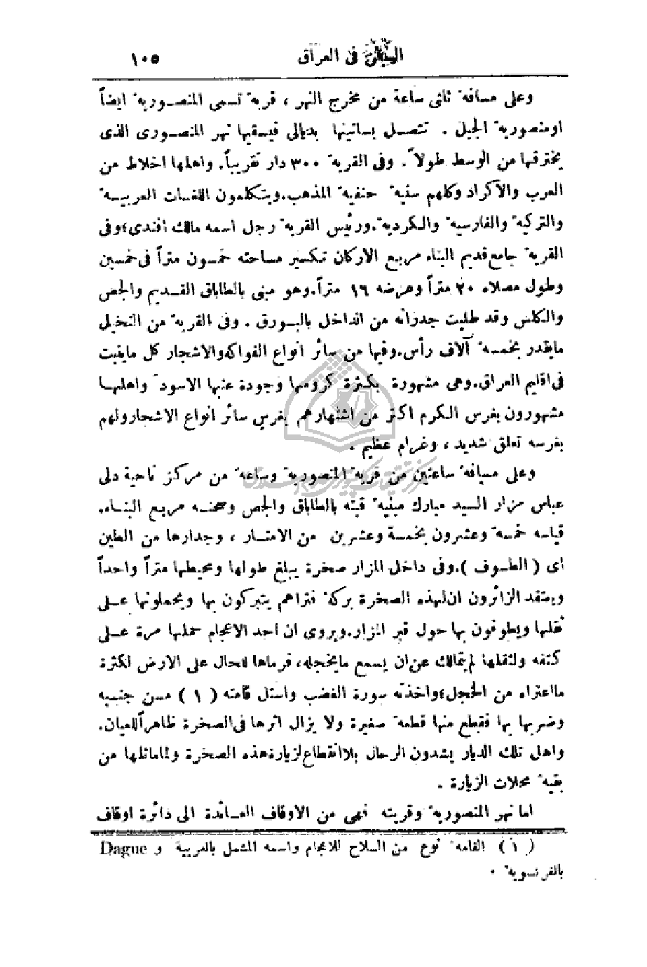 وعلى مسافة ثلثي ساعة من مخرج النهر، قرية تسمى المنصورية أيضاً أو منصورية الجبل. تتصل بساتينها بديالى فيسقيها نهر المنصوري الذي يخترقها من الوسط طولاً. وفي القرية 300 دار تقريباً. وأهلها أخلاط من العرب والأكراد وكلهم سنية حنفية المذهب ويتكلمون اللغات العربية والتركية والفارسية والكردية. ورئيس القرية رجل اسمه مالك أفندي؛ وفي القرية جامع قديم البناء مربع الأركان تكسير مساحته خمسون متراً في خمسين