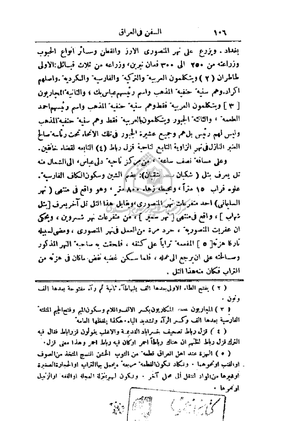 بغداد. ويزرع على نهر المنصوري الأرز والقطن وسائر أنواع الحبوب وزراعته من 250 إلى 300 فدان نيرين، وزراعه من ثلاث قبائل: الأولى طاطران ويتكلمون العربية والتركية والفارسية والكردية. وأصلهم أكراد. وهم سنية حنفية المذهب واسم رئيسهم عباس بك؛ والثانية المجاريون ويتكلمون العربية فقط وهم سنية حنفية المذهب واسم رئيسهم احمد الطعمة، والثالثة الجبور ويتكلمون بالعربية فقط وهم سنية حنفية المذهب وليس لهم رئيس بل هم وجميع عشيرة الجبور في تلك الأنحاء تحت رئاسة صالح العنبر النازل في نهر الزاوية التابع لناحية قزل رباط التابعة لقضاء خانقين.