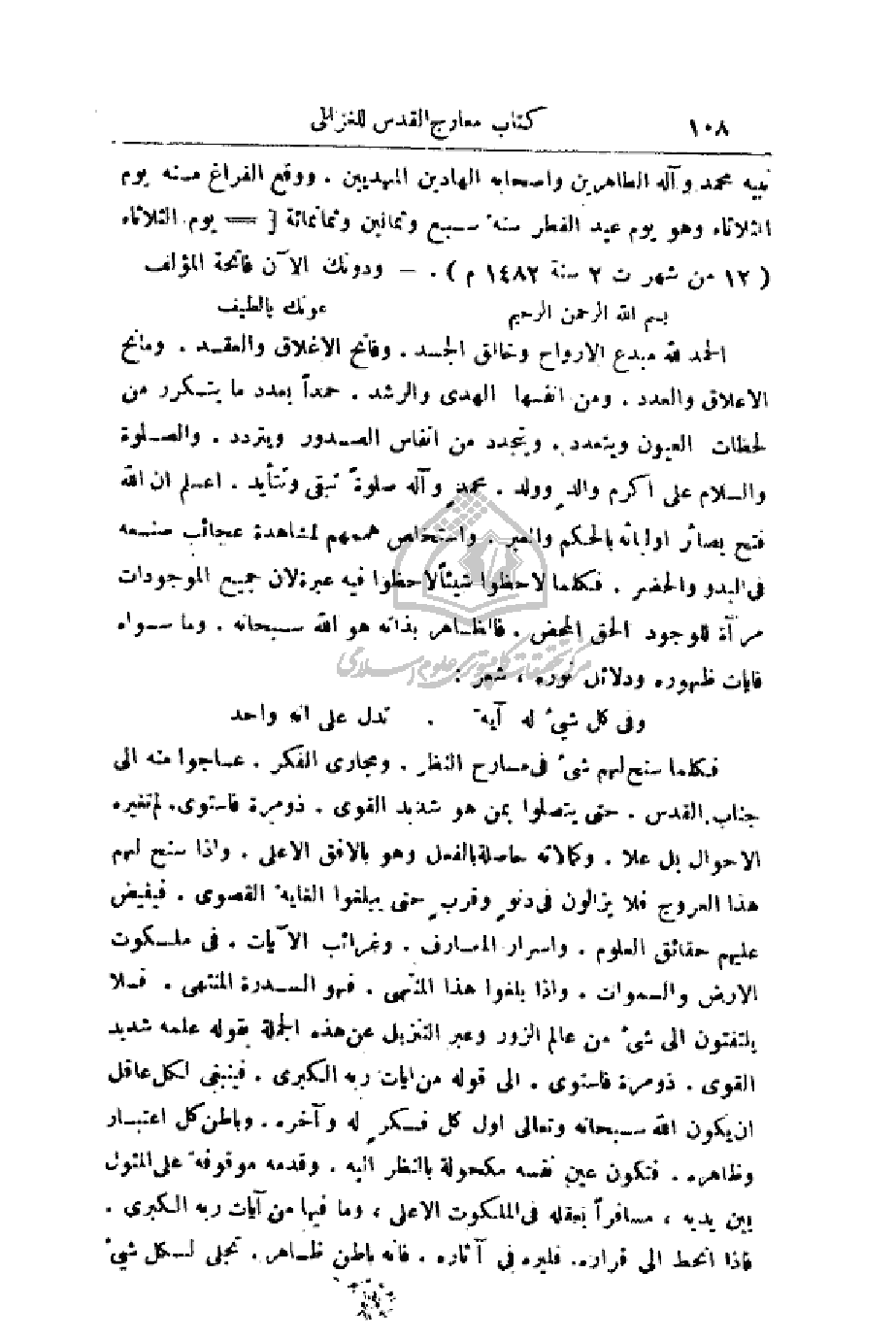 نبيه محمد وآله الطاهرين وأصحابه الهادين المهدين. ووقع الفراغ منه يوم الثلاثاء وهو يوم عيد الفطر سنة سبع وثمانين وثمانمائة (- يوم الثلاثاء 12 من شهر ت 2 سنة 1482م). - ودونك الآن فاتحة المؤلف:
