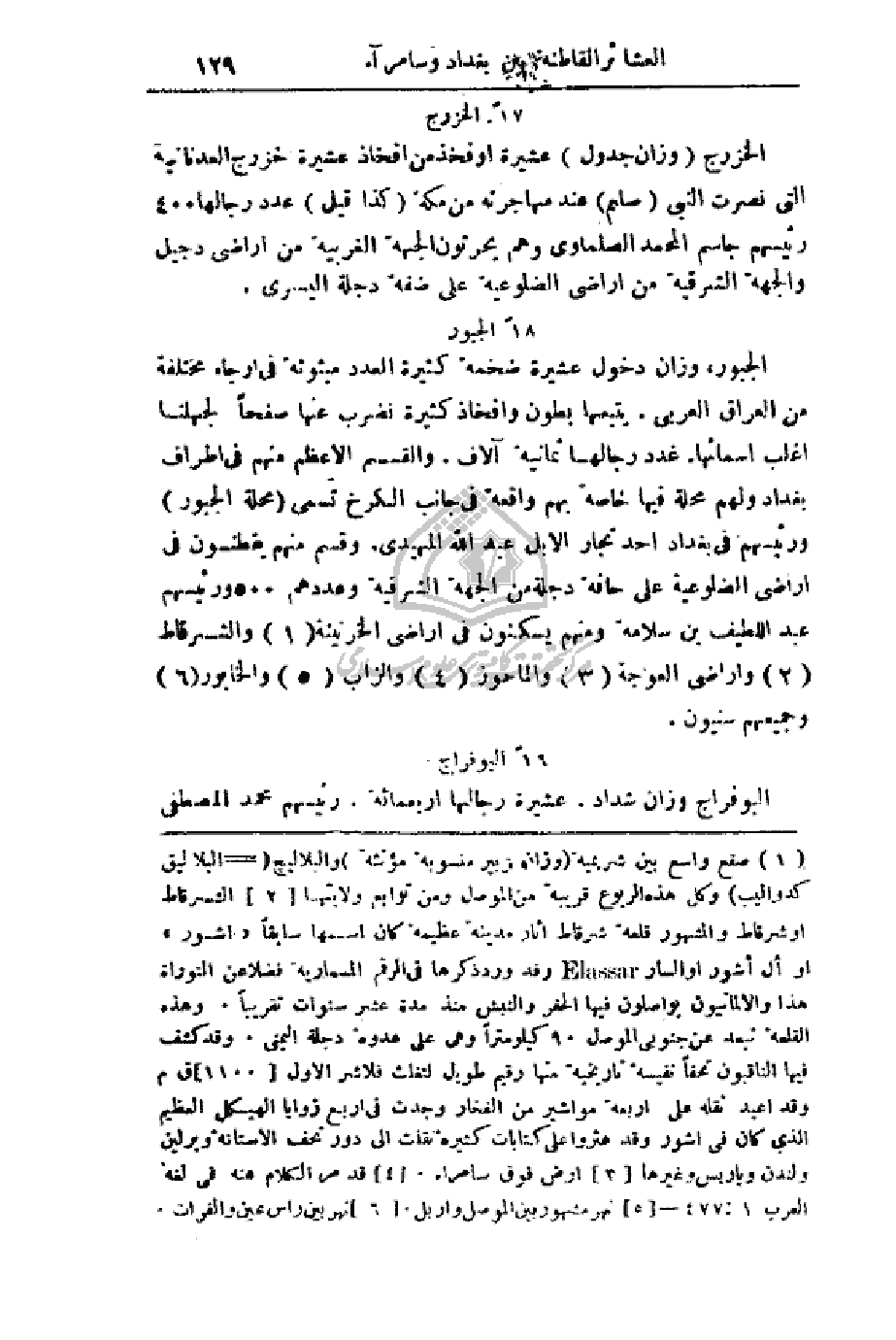 الجبور، وزان دخول عشيرة ضخمة العدد مبثوثة في أرجاء مختلفة من العراق العربي. يتبعها بطون وأفخاذ كثيرة نضرب عنها صفحاً لجهلنا اغلب أسمائها. عدد رجالها ثمانية آلاف. والقسم الأعظم منهم في أطراف بغداد ولهم فيها خاصة بهم واقعة في جانب الكرخ تسمى (محلة الجبور) ورئيسهم في بغداد أحد تجار الأبل عبد الله المهيدي. وقسم منهم يقطنون في أراضي الضلوعية على حافة دجلة من الجهة الشرقية وعددهم 500 ورئيسهم عبد اللطيف بن سلامة ومنهم يسكنون في أراضي الخرنينة والشرقاط وأراضي العوجة والماحوز
