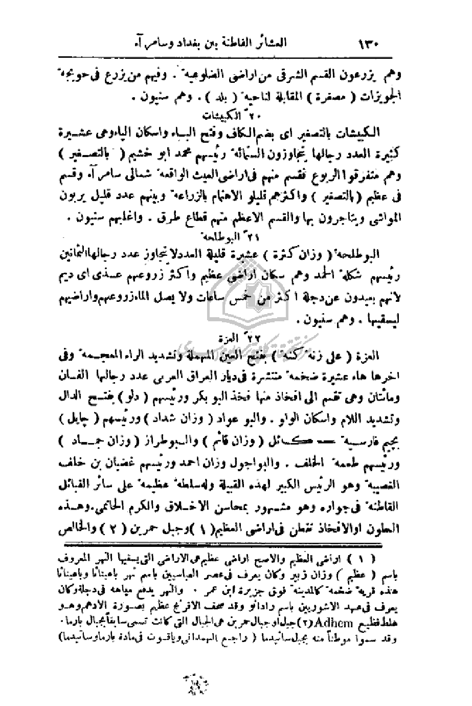 الكبيشات بالتصغير أي بضم الكاف وفتح الباء وإسكان الياء وهي عشيرة كثيرة العدد رجالها يتجازون الستمائة رئيسهم محمد أبو خشيم (بالتصغير) وهم متفرقوا الربوع فقسم منهم في أراضي العيث الواقعة شمالي سامراء وقسم في عظيم (بالتصغير) وأكثرهم قليلو الاهتمام بالزراعة وبينهم عدد قليل يربون المواشي ويتاجرون بها والقسم الأعظم منهم قطاع طرق. واغلبهم سنيون.
