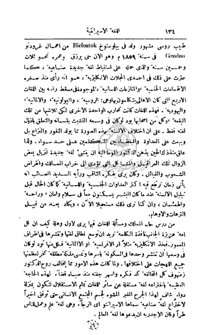 الأمور مما يخالف روح الدكتور زمنهوف كل المخالفة كد فكره واسهر جفنه منذ صباه قضاء لهذه الحاجة العظيمة باختراعه لغة مستقلة عن سائر اللغات تمام الاستقلال لتكون بمنزلة دواءٍ شافٍ لهذا الجرح الغير المشوه لجسم المجتمع الإنساني حتى توفق أخيراً لاختراع لغة صناعية سماها الاسبرانتو أي الرجاء وهي علم وعمل للناس طراً وكان الأجدر به أن يدعوها لغة العالم.