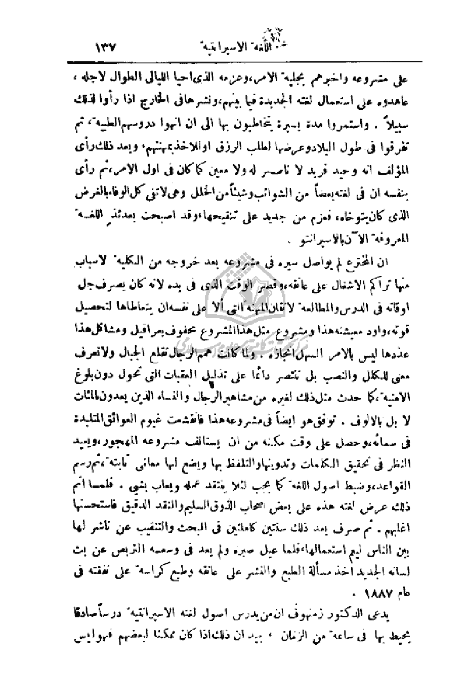 أن المخترع لم يواصل سيره في مشروعه بعد خروجه من الكلية لأسباب منها تراكم الأشغال على عاتقه، وقصر الوقت الذي في يده لأنه كان يصرف جل أوقاته في الدرس والمطالعة لإتقان المهنة التي ألا على نفسه أن يتعاطاها لتحصيل قوته، وأود معيشته هذا ومشروع مثل هذا المشروع محفوف بعراقيل ومشاكل هذا عددها ليس بالأمر السهل إنجازه. ولما كانت همم الرجال تقلع الجبال ولا تعرف معنى للكلل والنصب بل تنتصر دائما على تذليل العقبات التي تحول دون بلوغ الأمنية، كما حدث مثل ذلك لغيره من مشاهير الرجال والنساء الذين يعدون بالمئات لا بل بالألوف. توفق هو أيضاً في مشروعه هذا فانقشعت غيوم العوائق المتلبدة في سمائه، وحصل على وقت مكنه من أن يستأنف مشروعه المهجور، ويعيد النظر في تحقيق الكلمات وتدوينها والتلفظ بها ويضع لها معاني ثابتة، ثم رسم القواعد، وضبط أصول اللغة كما يجب لئلا ينتقد عمله ويعاب بشيء. فلما أتم ذلك عرض لغته هذه على بعض أصحاب الذوق السليم والنقد الدقيق فاستحسنها اغلبهم. ثم صرف بعد ذلك سنتين كاملتين في البحث والتنقيب عن ناشر لها بين الناس ليعم استعمالها، فلما عيل صبره ولم يعد في وسعه التربص عن بث لسانه الجديد اخذ مسألة الطبع والنشر على عاتقه وطبع كراسة على نفقته في عام 1887.