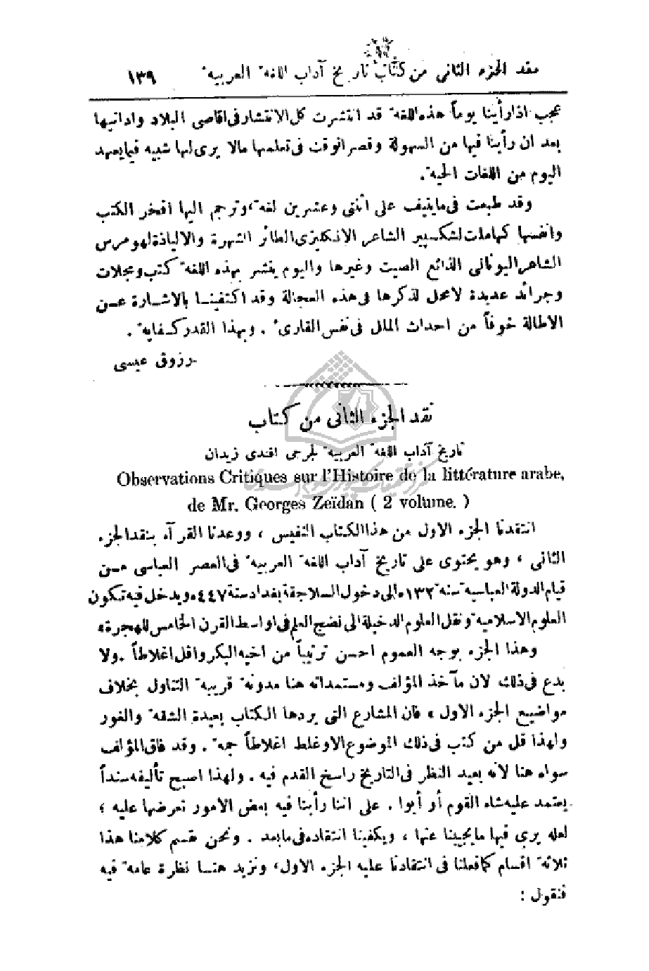 وهذا الجزء بوجه العموم احسن ترتيباً من أخيه البكر واقل أغلاطاً. ولا بدع في ذلك لأن مآخذ المؤلف ومستمداته هنا مدونة قريبة التناول بخلاف مواضيع الجزء الأول. فإن المشارع التي يردها الكتاب بعيدة الشقة والغور ولهذا قل من كتب في ذلك الموضوع إلا وغلط أغلاطاً جمة. وقد فاق المؤلف سواه هنا لأنه بعيد النظر في التاريخ راسخ القدم فيه. ولهذا اصبح تأليفه سنداً يعتمد عليه شاء القوم أو أبوا. على أننا رأينا فيه بعض الأمور نعرضها عليه؛ لعله يرى فيها ما يجيبنا عنها، ويكفينا انتقاده في ما بعد. ونحن نقسم كلامنا هذا ثلاثة أقسام كما فعلنا في انتقادنا عليه الجزء الأول، ونزيد هنا نظرة عامة فيه فنقول: